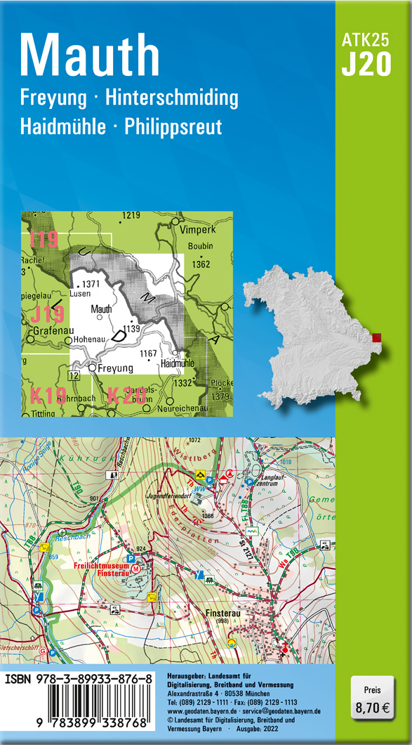 Wer es genau wissen will, greift zur ATK25. Diese Kartenserie im Maßstab 1:25000 bildet mit ihrer detaillierten Darstellung das komplette Verkehrsnetz mit allen Straßen und Wegen ab.237 Einzelblätter stellen Bayern flächendeckend dar. Ein Kartenblatt umfasst ca. 21 km x 22 km.Was bietet die ATK25?- individuelle Freizeitgestaltung mit allen ausgeschilderten Wander- und Radwanderwegen- sichere Orientierung auch abseits der markierten Routen- umfangreiches Spektrum an Freizeiteinrichtungen und Sehenswürdigkeiten- anschauliche Wiedergabe der GeländeformenKartenblatt ATK25-J20 Mauth:REGION: Niederbayern, Bayerischer Wald, BöhmerwaldORTE: Mauth, Freyung, Hinterschmiding, Haidmühle, Philippsreut, Grainet