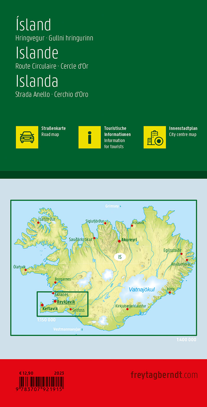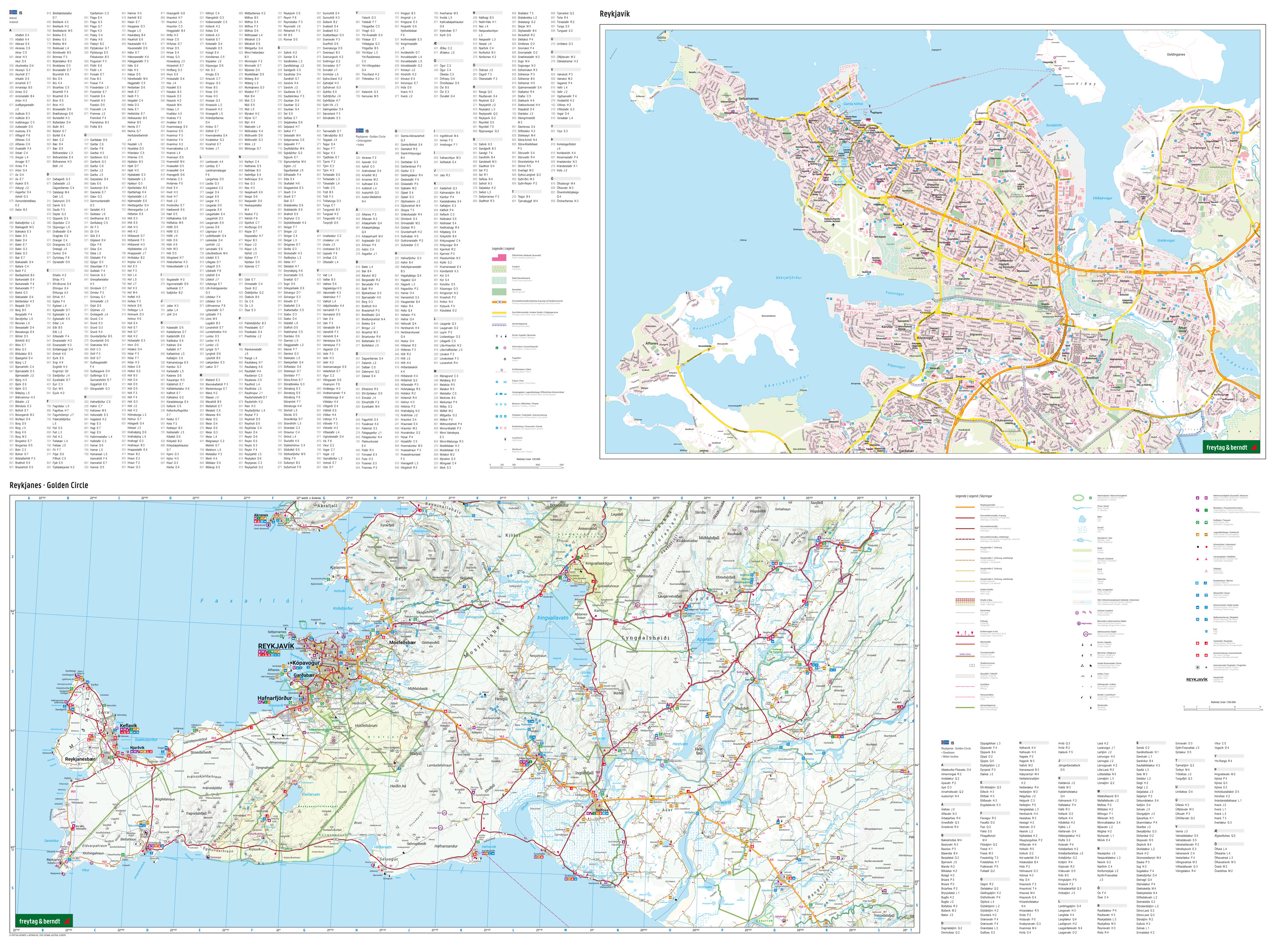 Auf der Rückseite der Autokarte findet sich neben einem Stadtplan von Reykjavik eine Detailkarte der Halbinsel Reykjanes mit dem Golden Circle im Maßstab 1:150.000. Im Südwesten Islands gelegen finden sich dort zahlreiche geothermische Highlights wie heiße Quellen, Schlammbecken und dampfende Fumarolen, sowie beeindruckende Landschaften entlang der Küste und faszinierende historische Stätten wie das Fischerdorf Grindavik und der Leuchtturm Reykjanesviti.