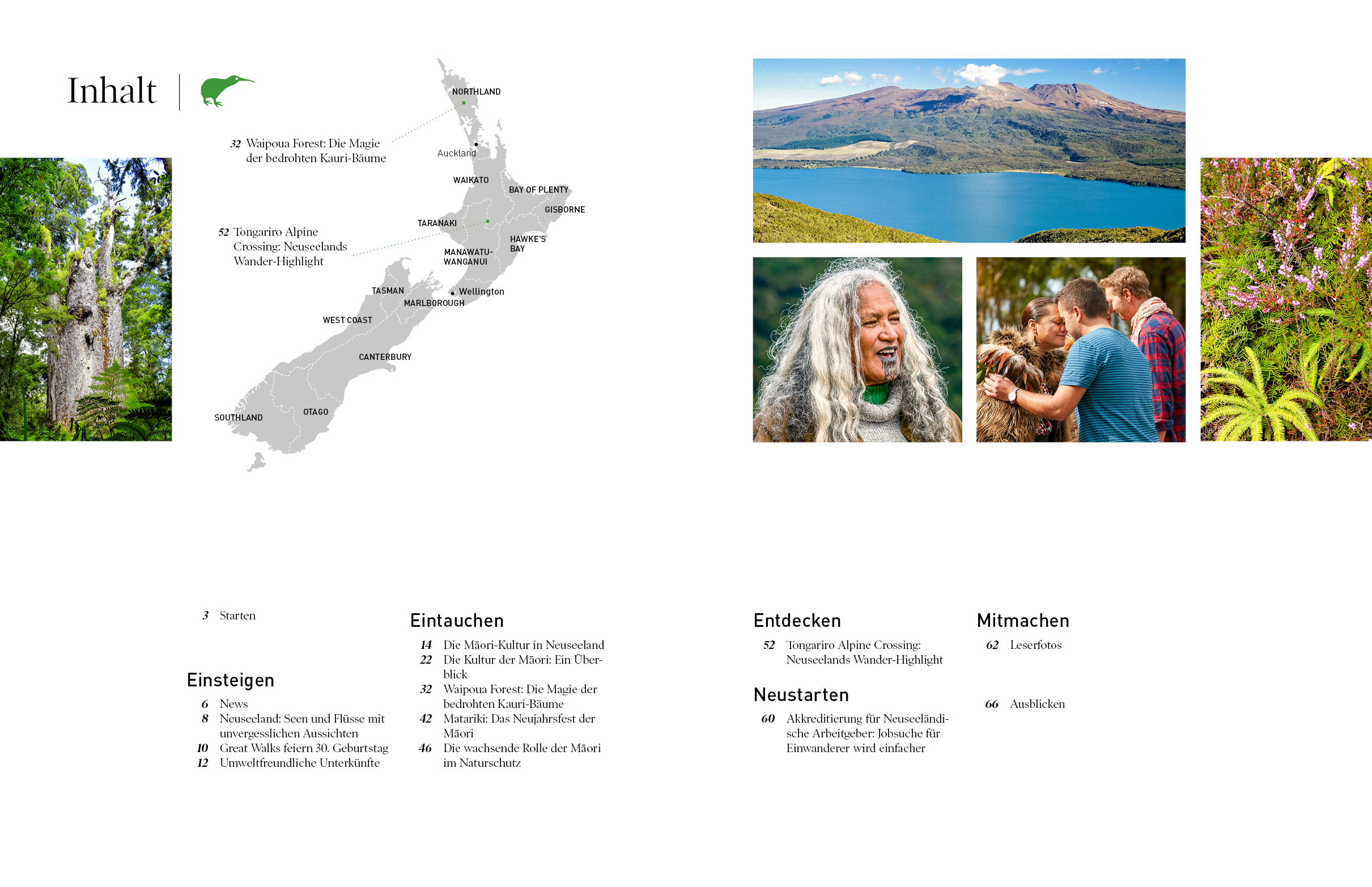 Dank ihres Kriegstanzes ist die Kultur der Maori mittlerweile weltberühmt: Die All Blacks, das nationale Rugby-Team, zelebriert den Haka vor jedem Spiel, um den Gegner einzuschüchtern. Und auch bei anderen Sportarten setzen die Aktiven zunehmend auf den motivierenden und furchteinflößenden Tanz. Doch die Kultur und das Leben der Maori bietet weit mehr als nur den Haka. Das Hangi - leckere Köstlichkeiten aus dem Erdofen - ist mindestens genauso populär. Hinzu kommt die Jahrhunderte alte Geschichte der Maori, ihrer Besiedlung Neuseelands und ihre teils kriegerischen Auseinandersetzungen mit der britischen Besatzungsmacht. In Museen, Shows und auf geführten Touren geben die Maori Einblick in ihr Leben, das sich seit dem Eintreffen der Briten grundlegend wandelte. In dieser Ausgabe von 360° Neuseeland legen wir den inhaltlichen Schwerpunkt auf die Maori-Kultur. Wir starten mit einer abwechslungsreichen Fotostory, anschließend beleuchten wir in einem Überblicksbeitrag wesentliche Elemente der Maori-Kultur im Alltag, die Kunst der Maori-Tätowierungen (Ta Moko), die Sprache (Te Reo Maori), den Haka und das Powhiri, die Begrüßungs- und Willkommenszeremonie der Maori. Gemeinsam mit unserer Autorin Jenny Beck besuchen wir anschließend den Waipoua Forest auf der Nordinsel, der mit seinen riesigen Kauri-Bäumen fester Bestandteil vieler Reiserouten ist. Alexandra Falk beleuchtet anschließend in ihrem Beitrag Matariki, das Neujahrsfest der Maori, das in diesem Jahr erstmals als offizieller Nationalfeiertag begangen wurde. Die wachsende Bedeutung der Maori im Umweltschutz erläutert uns zum Abschluss des Specials Ruth Bollongino, sie ist selbst als wissenschaftliche Beraterin in einem Naturschutzprojekt im Abel Tasman National Park tätig. Der Tongariro Alpine Crossing wird weltweit zu den schönsten Trekking-Touren gezählt und ist Neuseelands spektakulärste Tageswanderung. Michael Juhran berichtet uns von dem anstrengenden Aufstieg und den unvergesslichen Aussichten, die ihn begeistert haben.