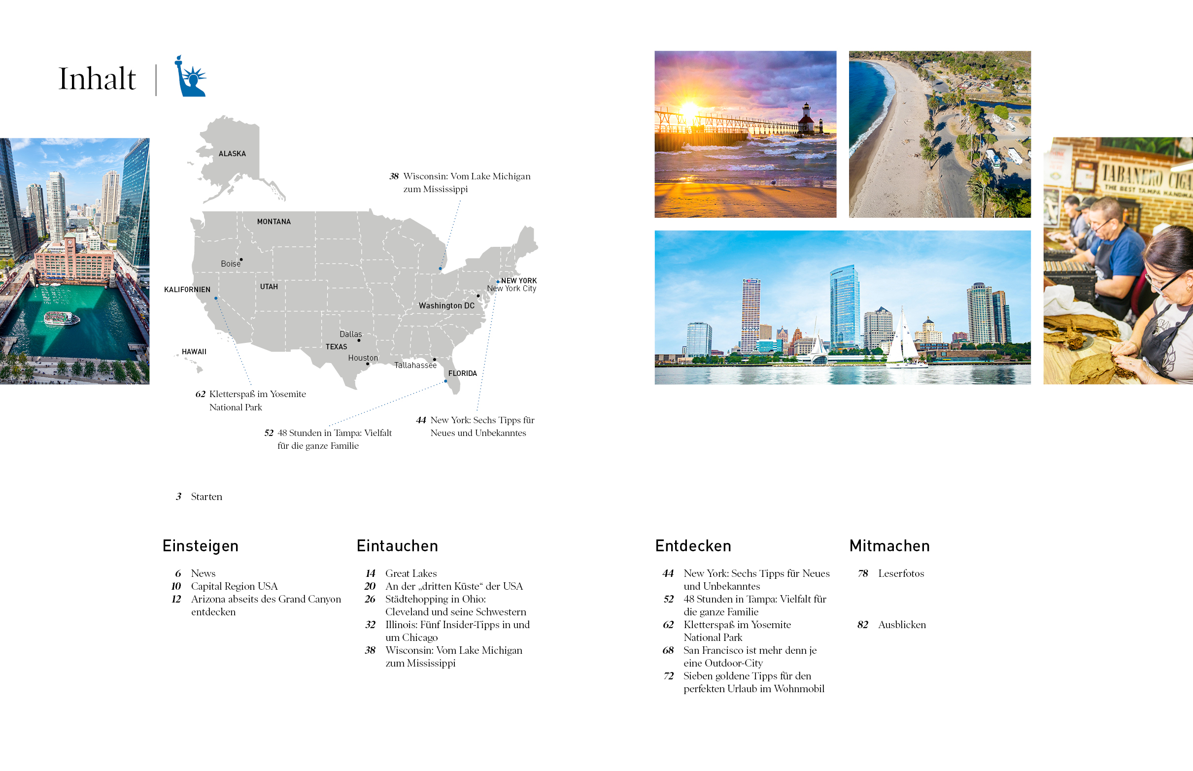 In dieser Ausgabe stellen wir Ihnen in unserem Special die Great Lakes ausführlich vor. Natürlich ist Chicago weithin bekannt - doch entlang der Großen Seen als der "dritten Küste" der USA gibt es weitaus mehr zu entdecken. Thomas Becker ist vorausgereist und hat viele Eindrücke und Tipps mitgebracht: beispielsweise von aufstrebenden Städten wie Cleveland in Ohio und einer Reise durch Wisconsin, vom Lake Michigan bis zum Mississippi. Währenddessen hat Christian Dose wieder einmal dem Big Apple einen Besuch abgestattet. Sein Fazit: Gerade jetzt präsentiert sich New York gefühlt schöner denn je zuvor. Ebenfalls einen Besuch wert: das vielfältige Tampa, Florida, das mehr als nur die Achterbahnen im Vergnügungspark Busch Gardens zu bieten hat. Mit einem Adrenalinkick der ganz anderen Art lockt der populäre Yosemite National Park in Kalifornien: Michael Juhran kletterte zwar nicht den berühmten El Capitan hinauf - seine Kletterroute war aber nicht minder spektakulär. Überdies sprach London Nicole Breed, Bürgermeisterin von San Francisco, im Interview mit 360° USA über die Folgen der Pandemie, den Wandel der Stadt und neue spektakuläre Attraktionen. Unterdessen ist die Einreise in die USA mit dem Wegfall der Corona-Testpflicht erleichtert worden. Dann kann man auch leichter darüber hinweg sehen, dass die Kosten für die Einreiseanmeldung ESTA auf 21 US-Dollar gestiegen sind. Nur eines bleibt allen Reisenden zu wünschen: dass die Flüge möglichst störungsfrei verlaufen!