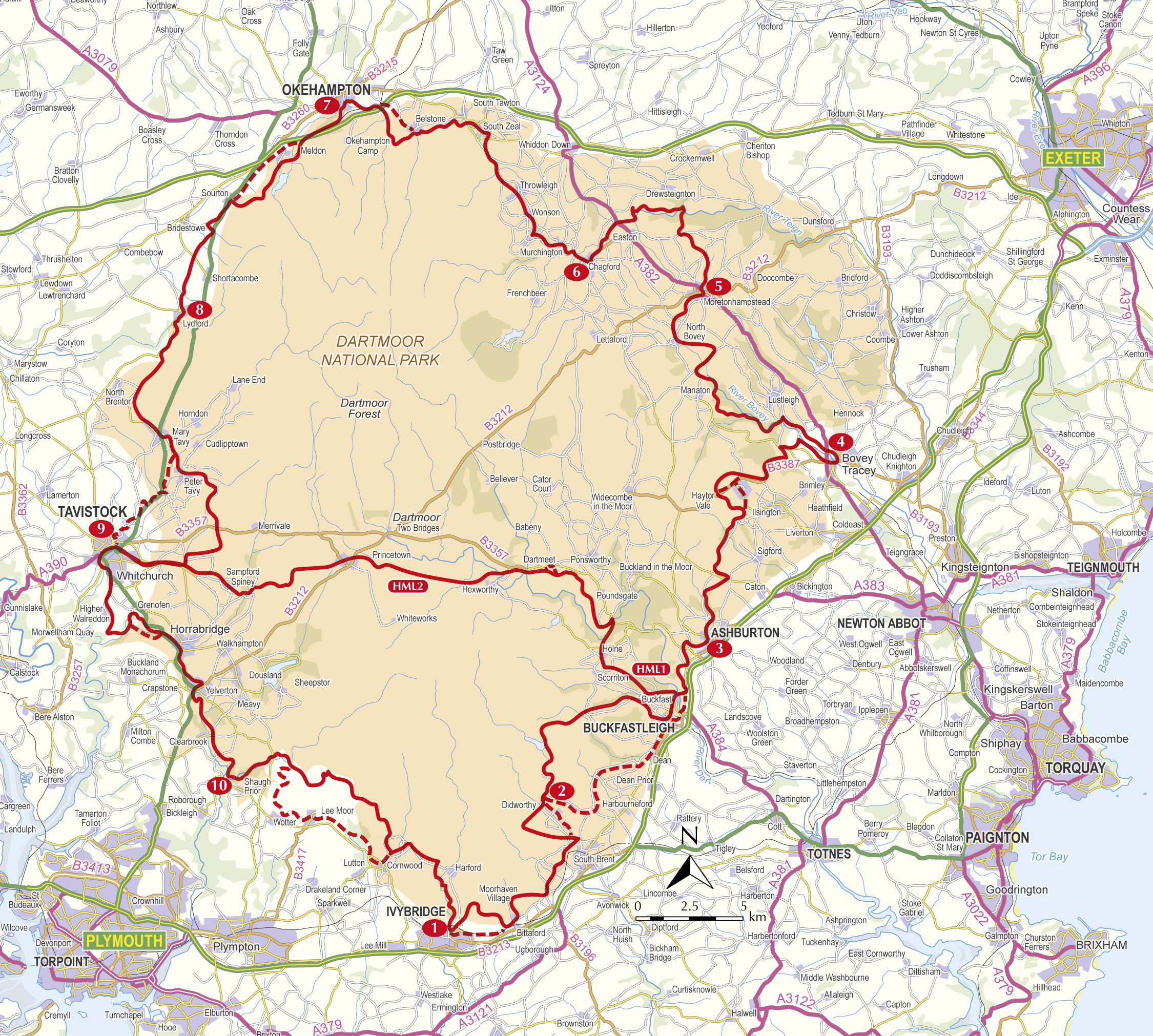 The route is described anticlockwise from Ivybridge in 10 stages, each between 12 and 21km (8–13 miles). Each stage includes low-level detours in case of bad weather, as well as details of walking the route in reverse. The 2-stage, 37km (23 mile) High Moor Link is also described.