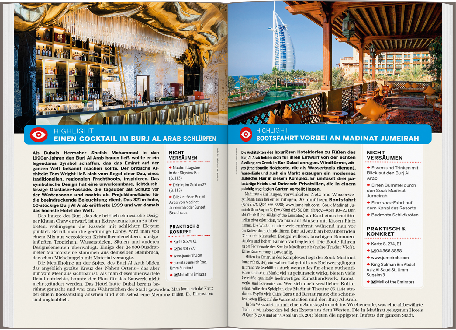 Mit dem Lonely Planet Dubai auf eigene Faust durch die Stadt am Persischen Golf. Etliche Monate Recherche stecken im Kultreiseführer für Individualreisende. Auf rund 300 Seiten geben die Autorinnen sachkundige Hintergrundinfos zum Reiseland, liefern Tipps und Infos für die Planung der Reise, beschreiben alle interessanten Sehenswürdigkeiten mit aktuellen Öffnungszeiten und Preisen und präsentieren ihre persönlichen Entdeckungen und Tipps. Besuchen Sie eine Stadt, die keinen Stillstand zu kennen scheint und über zahlreiche Superlative verfügt: das höchste Gebäude der Welt, eine künstliche Insel, die in Form einer Palmenkrone ins Meer gebaut wurde und eine Achterbahn, die in 4,9 sec. von 0 auf 240 beschleunigt. Machen Sie einen Bummel durch die Souks von Deira, spazieren Sie in Bur Dubai am Wasser entlang, entspannen Sie sich in einem Shisha-Cafe in Abu Dhabi oder besuchen Sie ein Kamelrennen in Al Wathba. Und wo übernachten und essen? Für jeden Stadtteil gibt es eine Auswahl an Unterkünften und Restaurants für jeden Geschmack und Geldbeutel.