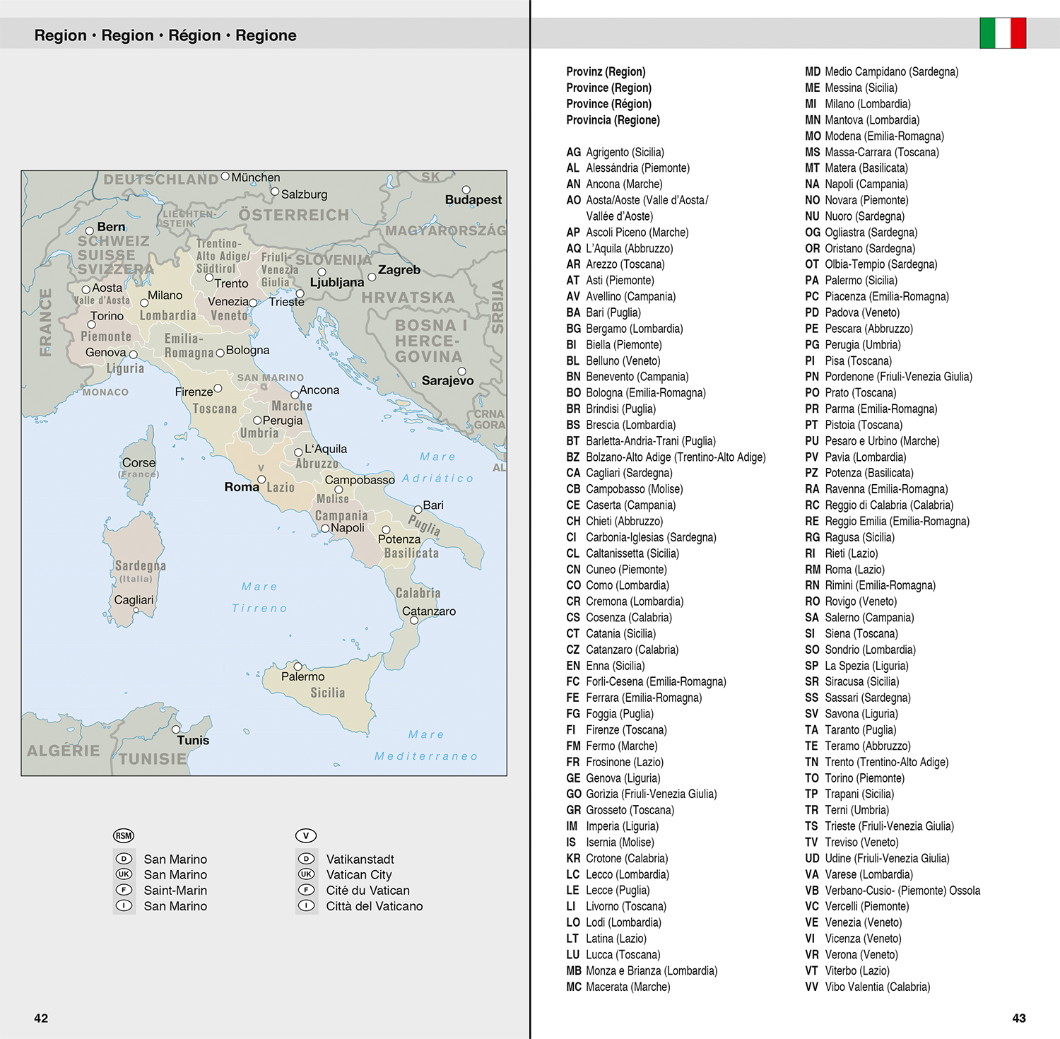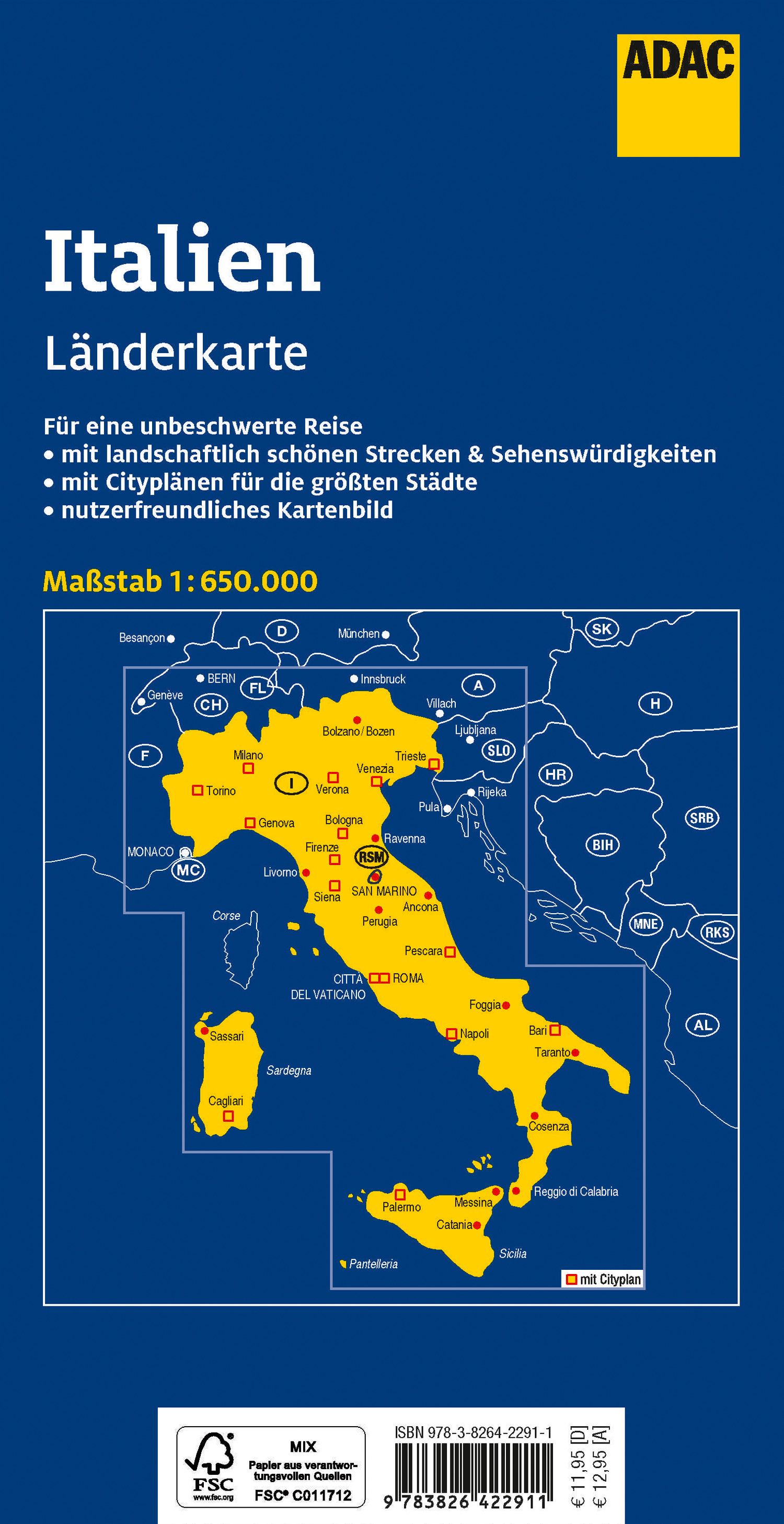 Hauptkarte im Maßstab 1:650 000, beidseitig bedruckt; Registerheft: mehrsprachige Legende (D, GB, F, I)/ 16 Citypläne: - Bari - Bologna - Cagliari - Città del Vaticano - Firenze - Genova - Milano - Napoli - Palermo - Pescara - Roma - Siena - Torino - Trieste - Venezia - Verona/ Übersichtskarte der italienischen Regionen/ Ortsregister mit Postleitzahl, Provinz und Suchfeldangabe.