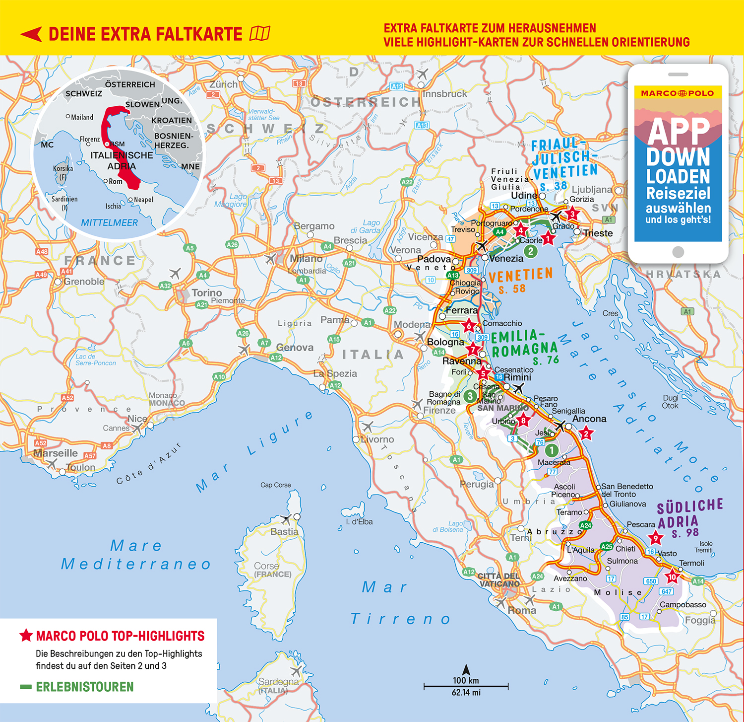 Mit deinem MARCO POLO Reiseführer im Gepäck entdeckst du, wie vielseitig die Landschaft im Rücken der endlosen Liegestuhlreihen in Wahrheit ist: Erkunde malerische Altstädte auf Felsen über dem Meer, elegante Seebäder oder kleine Fischerorte. Im Nordosten die Klippen bei Triest, dann die Lagunenseen von Grado oder das sagenhafte Venedig sind nur einige der vielen Highlights, die deinen Italienurlaub zum unvergesslichen Erlebnis machen!