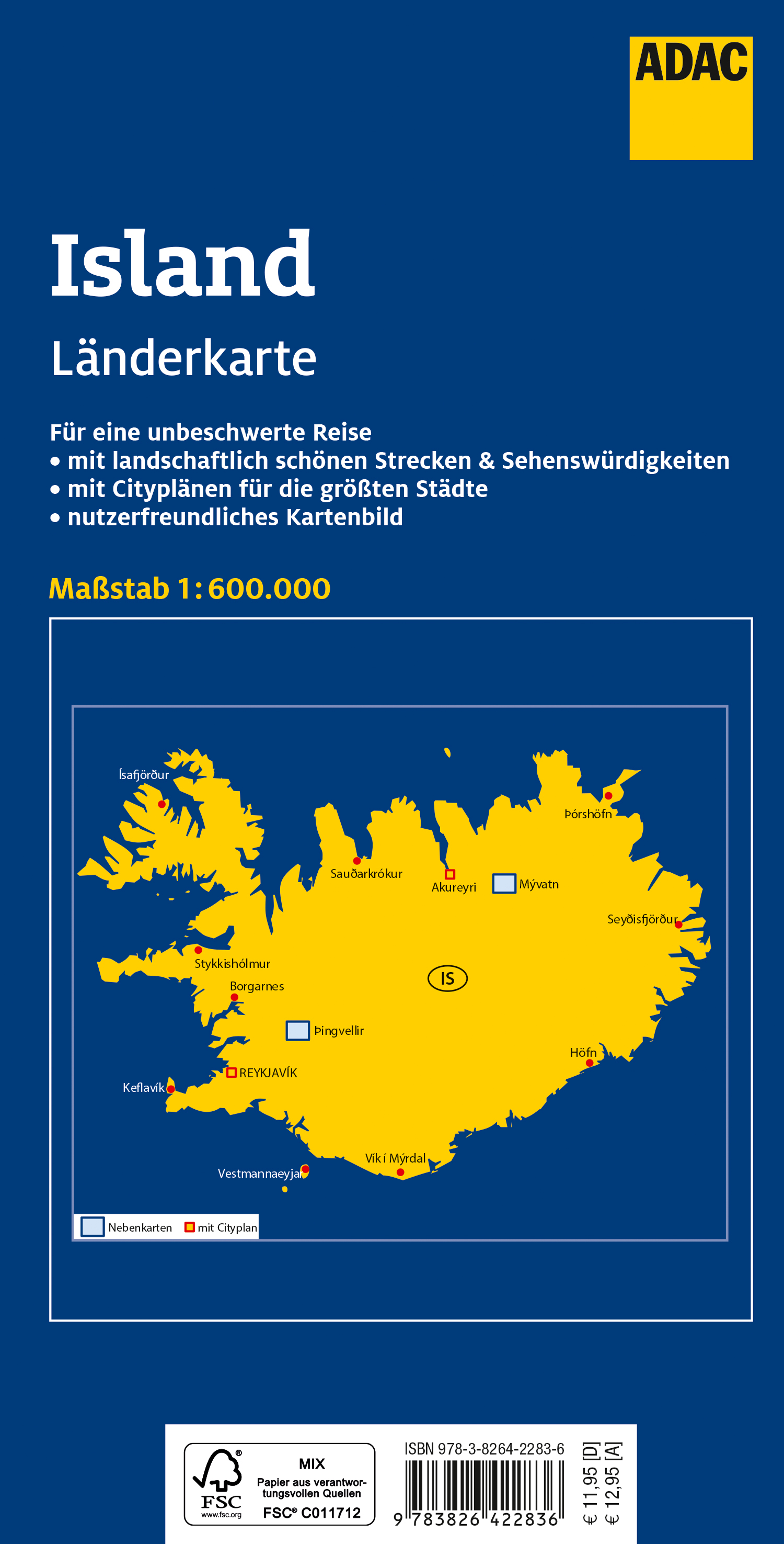 Hauptkarte im Maßstab 1:600 000; Registerheft: mehrsprachige Legende (D, GB, F, IS)/ Nebenkarten von Hekla, Mývatn, Þingvellir/ Cityplan von Reykjavík/ Buslinienplan/ Ortsregister mit Verwaltungseinheit, Suchfeldangabe und Postleitzahl/ Ausgewählte Sehenswürdigkeiten, Landschafts- und Gewässernamen mit Suchfeldangabe