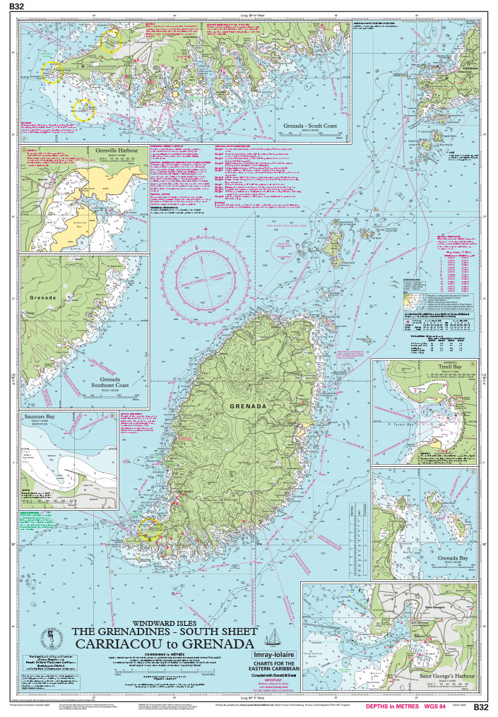 Plans included: Tyrrel Bay (Carriacou) (1:17 500) Grenada Bay (1:30 000) Grenville Harbour (1:15 000) Grenada - Southeast Coast (1:45 000) Grenada - South Coast (1:40 000) Saint George's Harbour (1:12 500)