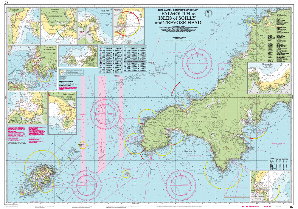 Chart scale 1:120 000 Plans included: Newquay Bay (1:10 000) Saint Ives (1:15 000) St Mary's Road (1:25 000) Hugh Town (1:10 000) Mousehole (1:5000) Newlyn Harbour (1:12 000) Penzance (1:12 000) Saint Michael's Mount (1:12 500) Porthleven (1:5000)