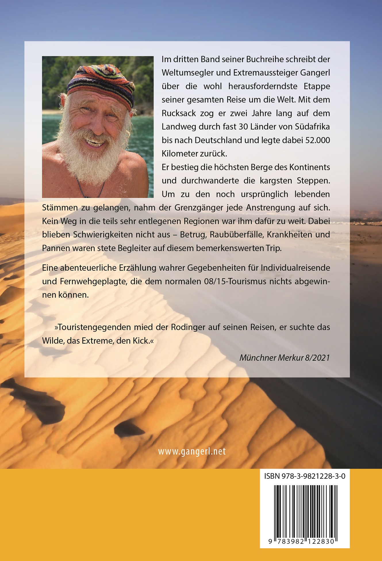 Im dritten Band seiner Buchreihe schreibt der Weltumsegler und Extremaussteiger Gangerl über die wohl herausforderndste Etappe seiner gesamten Reise um die Welt. Mit dem Rucksack zog er zwei Jahre lang auf dem Landweg durch fast 30 Länder von Südafrika bis nach Deutschland und legte dabei 52.000 Kilometer zurück. Er bestieg die höchsten Berge des Kontinents und durchwanderte die kargsten Steppen. Um zu den noch ursprünglich lebenden Stämmen zu gelangen, nahm der Grenzgänger jede Anstrengung auf sich. Kein Weg in die teils sehr entlegenen Regionen war ihm dafür zu weit. Dabei blieben Schwierigkeiten nicht aus – Betrug, Raubüberfälle, Krankheiten und Pannen waren stete Begleiter auf diesem bemerkenswerten Trip.