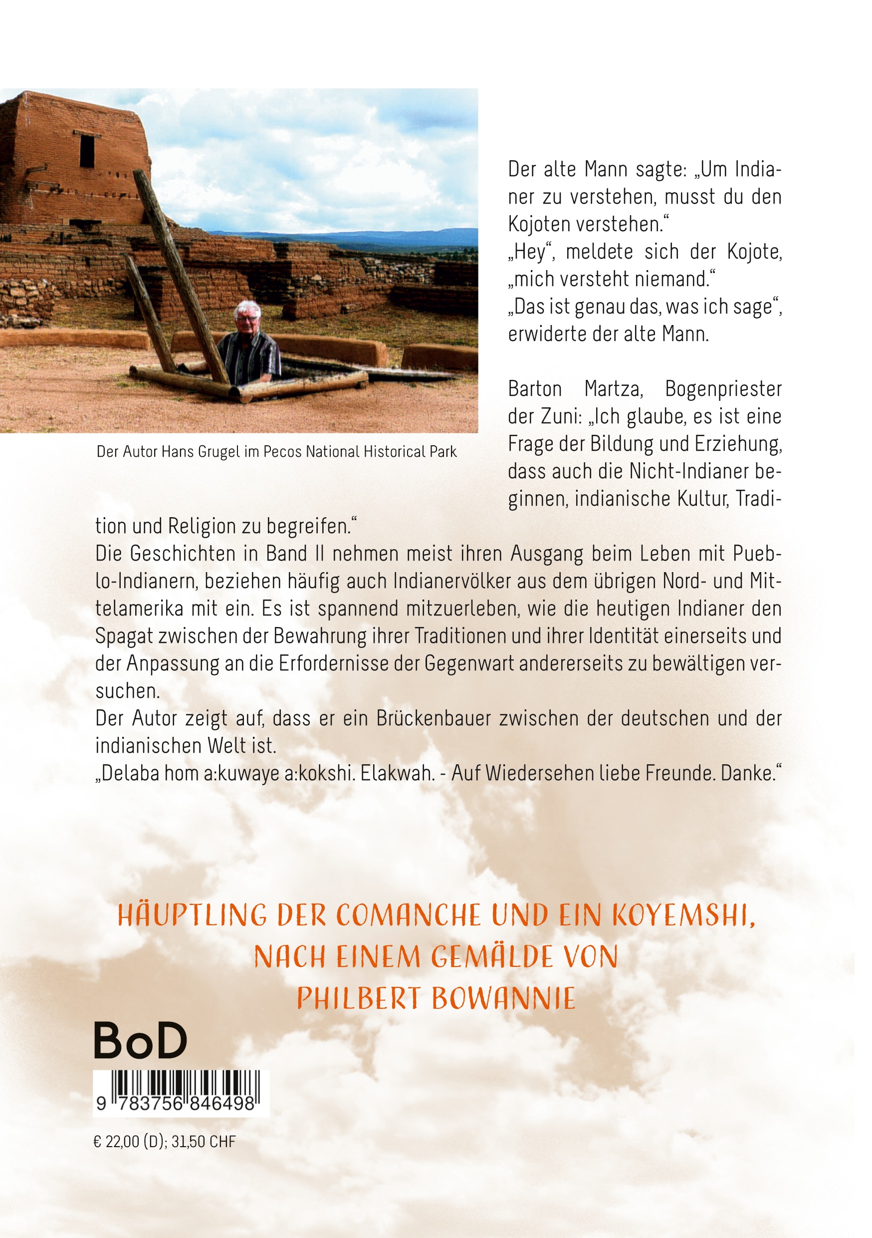Der alte Mann sagte: "Um Indianer zu verstehen, musst du den Kojoten verstehen." "Hey", meldete sich der Kojote, "mich versteht niemand." "Das ist genau das, was ich sage", erwiderte der alte Mann. Barton Martza, Bogenpriester der Zuni: "Ich glaube, es ist eine Frage der Bildung und Erziehung, dass auch die Nicht-Indianer beginnen, indianische Kultur, Tradition und Religion zu begreifen." Die Geschichten in Band II nehmen meist ihren Ausgang beim Leben mit Pueblo-Indianern, beziehen häufig auch Indianervölker aus dem übrigen Nord- und Mittelamerika mit ein. Es ist spannend mitzuerleben, wie die heutigen Indianer den Spagat zwischen der Bewahrung ihrer Traditionen und ihrer Identität einerseits und der Anpassung an die Erfordernisse der Gegenwart andererseits zu bewältigen versuchen. Der Autor zeigt auf, dass er ein Brückenbauer zwischen der deutschen und der indianischen Welt ist. "Delaba hom a:kuwaye a:kokshi. Elakwah. - Auf Wiedersehen liebe Freunde. Danke."