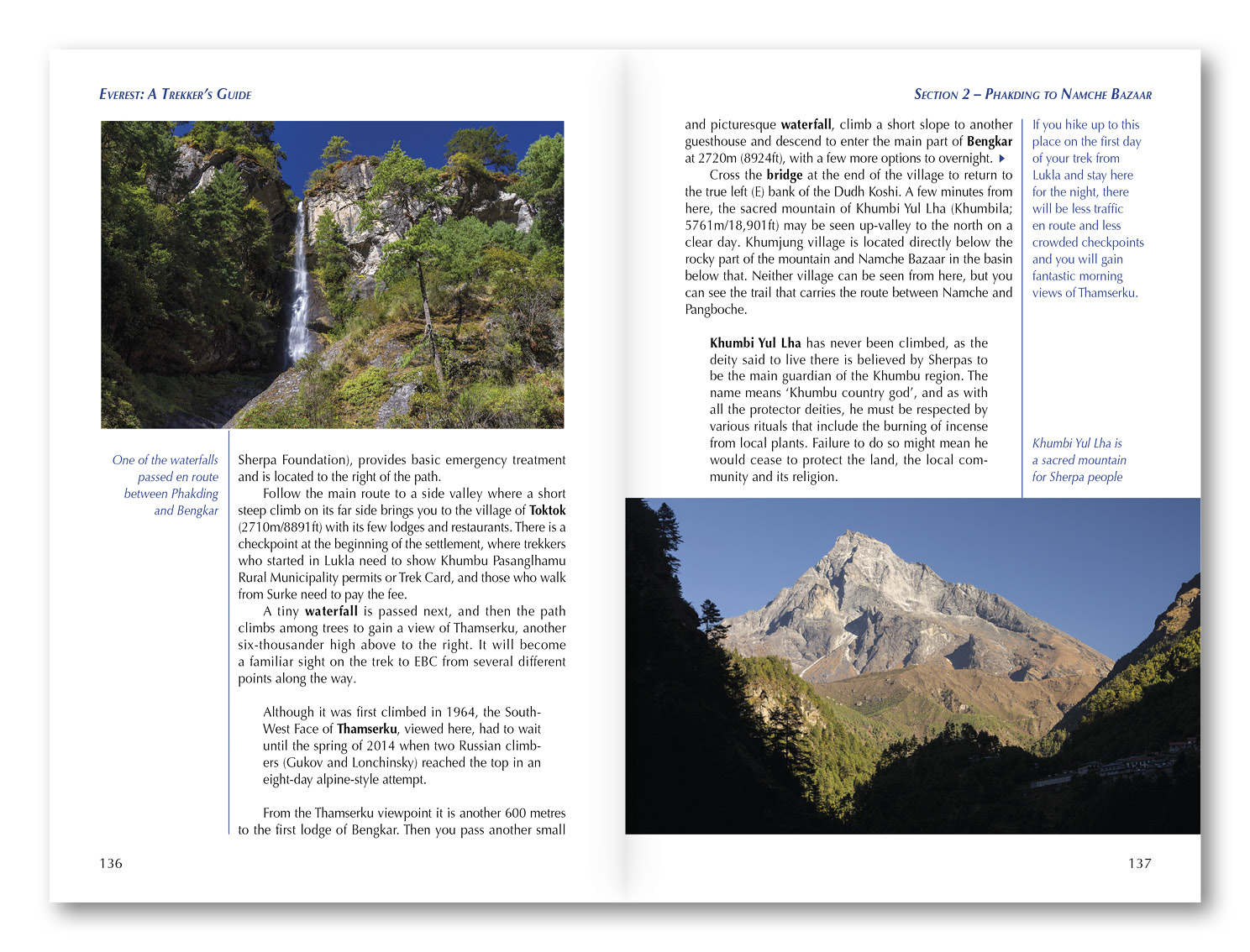 Treks range from 19 to 91km (12–56 miles) and can be completed in 2–16 days. The routes include the classic Everest Base Camp trek from Lukla via Namche Bazaar and Gorak Shep, an ascent of Kala Patthar, the route from Jiri to Lukla taken by Tenzing Norgay and Sir Edmund Hillary, a trek north to Gokyo and the Three Passes Trek linking the region's major passes and valleys. A trek approaching Everest from Tibet, from Kharta to the Kangshung Face, is also included.