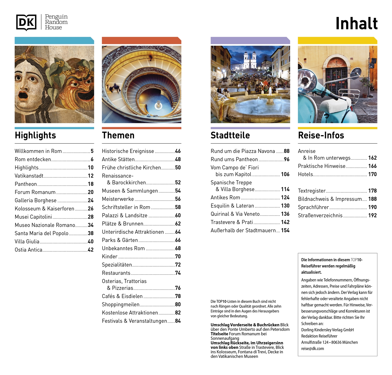 Besuchen Sie weltberühmte Monumente wie das Kolosseum, das Forum Romanum und den Circus Maximus im antiken Rom oder schlendern Sie durch die malerischen Gassen von Trastevere - im TOP10 Rom-Reiseführer werden die einzelnen Stadtteile von Rom übersichtlich und ausführlich porträtiert. Stimmungsvolle Fotos und detaillierte Stadtteil-Karten zeigen berühmte Sehenswürdigkeiten, charmante Stadtviertel sowie Restaurant-, Shopping- oder Tourenvorschläge auf einen Blick.