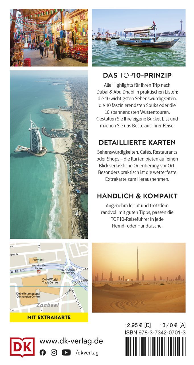 Extrakarte zum Herausnehmen: Damit Sie im Urlaub nicht die Orientierung verlieren, ist der Top 10 Reiseführer Dubai & Abu Dhabi mit einer laminierten Karte ausgestattet. Hier finden Sie übersichtliche Stadtpläne sowie einen Plan des öffentlichen Nahverkehrs von Dubai zum Mitnehmen und Nachschauen.