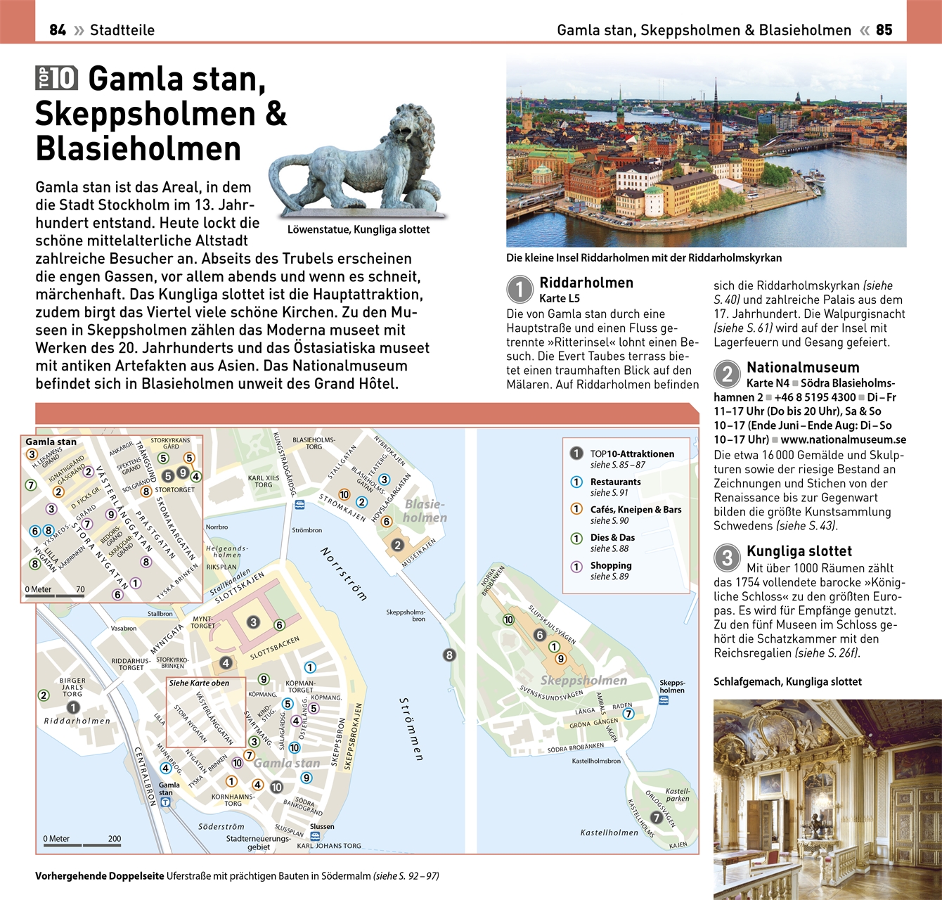 Norrmalm & City, Kungsholmen & Vasastan, Gamla stan, Skeppsholmen & Blasieholmen - im TOP10 Stockholm-Reiseführer werden die einzelnen Stadtteile und das Umland Stockholms übersichtlich und ausführlich porträtiert. Stimmungsvolle Fotos und detaillierte Stadtteil-Karten zeigen berühmte Sehenswürdigkeiten, charmante Stadtviertel sowie Restaurant-, Shopping- oder Tourenvorschläge auf einen Blick.
