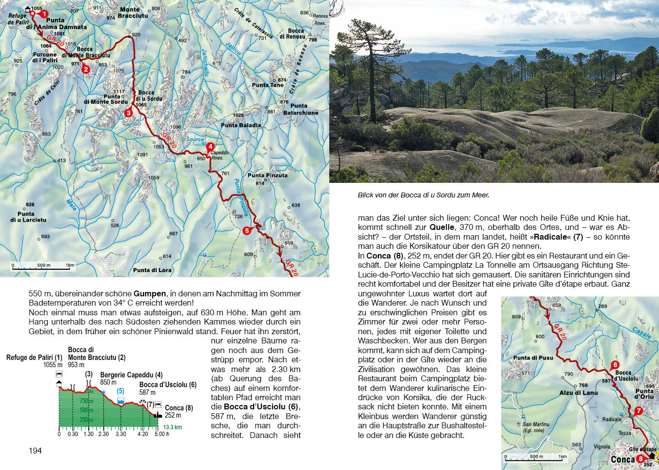 Es werden Gipfelabstecher, Varianten sowie Abstiegs- und Einstiegsmöglichkeiten aufgezeigt, sodass man sich auch kleinere Mehrtagestouren auf dem GR 20 zusammenstellen kann. Den Wanderer erwartet Natur pur – herrliche Ausblicke, enge Schluchten, erfrischende Badebecken – und dazu korsische Köstlichkeiten, wie Käse aus den zahlreichen Bergerien.