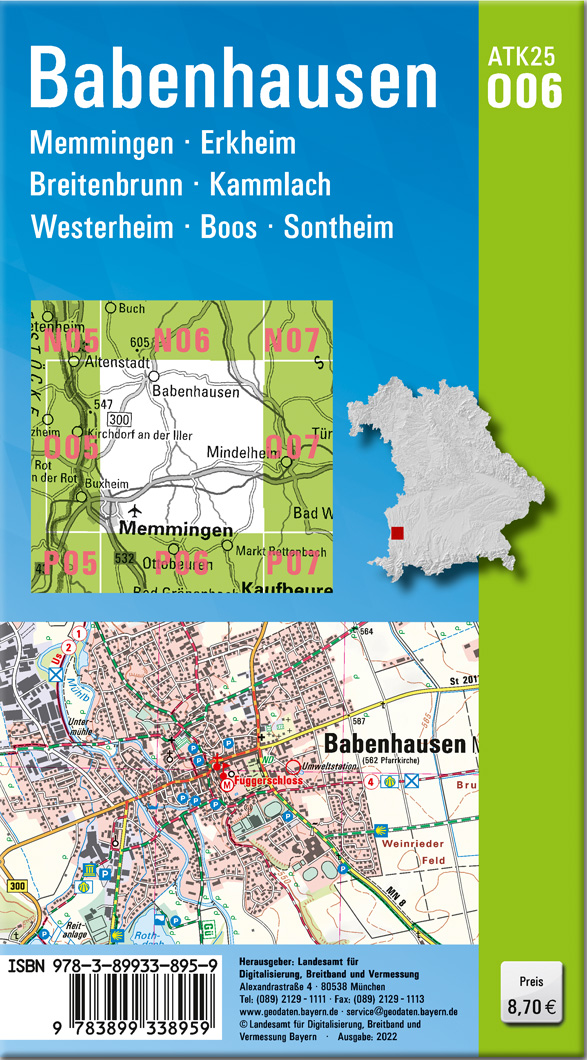 Wer es genau wissen will, greift zur ATK25. Diese Kartenserie im Maßstab 1:25000 bildet mit ihrer detaillierten Darstellung das komplette Verkehrsnetz mit allen Straßen und Wegen ab.237 Einzelblätter stellen Bayern flächendeckend dar. Ein Kartenblatt umfasst ca. 21 km x 22 km.Was bietet die ATK25?- individuelle Freizeitgestaltung mit allen ausgeschilderten Wander- und Radwanderwegen- sichere Orientierung auch abseits der markierten Routen- umfangreiches Spektrum an Freizeiteinrichtungen und Sehenswürdigkeiten- anschauliche Wiedergabe der GeländeformenKartenblatt ATK25-O06 Babenhausen:REGION: Schwaben, AllgäuORTE: Babenhausen, Memmingen, Erkheim, Breitenbrunn, Kammlach, Westerheim, Boos, Sontheim