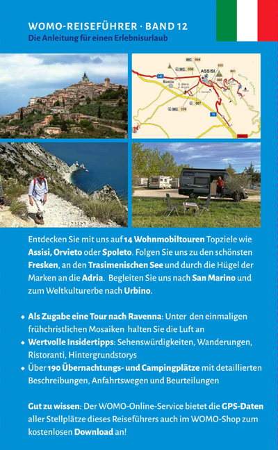 Entdecken Sie mit uns auf 14 Wohnmobiltouren Topziele wie Assisi, Orvieto oder Spoleto. Folgen Sie uns zu den schönsten Fresken, an den Trasimenischen See und durch die Hügel der Marken an die Adria. Begleiten Sie uns nach San Marino und zum Weltkulturerbe nach Urbino.