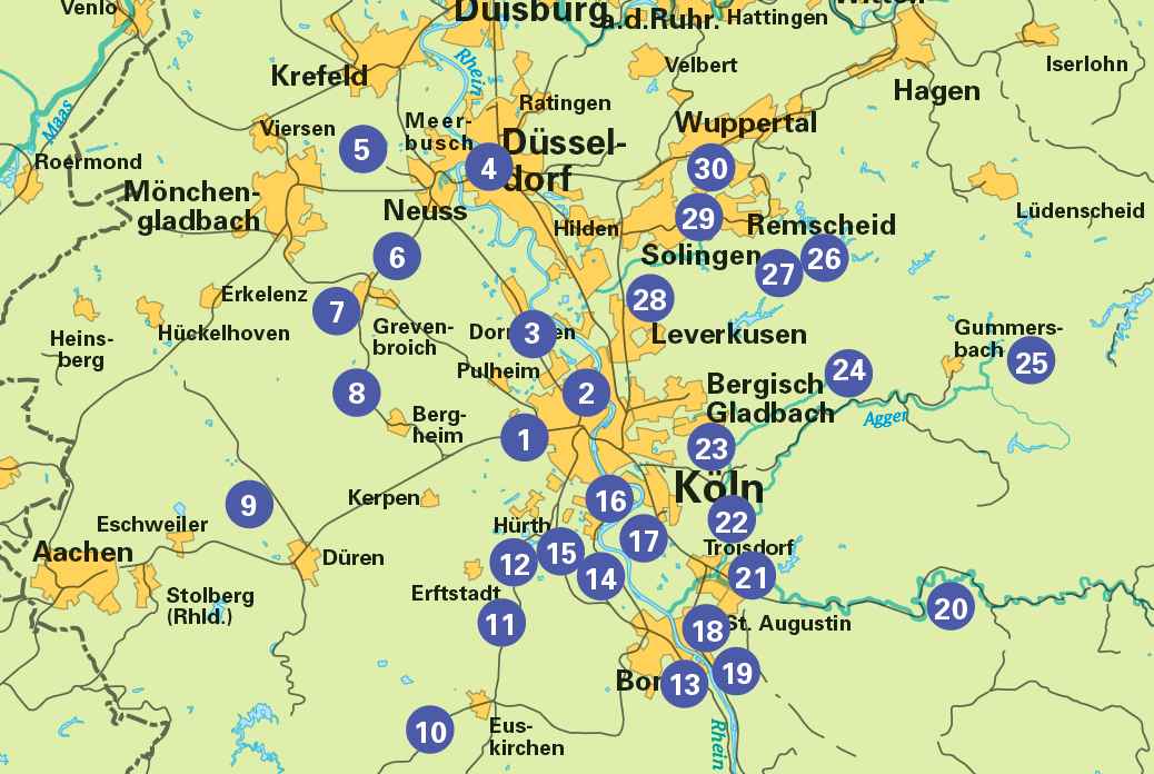Köln, Düsseldorf, Neuss, Bonn, Siegburg, Lennep und Solingen