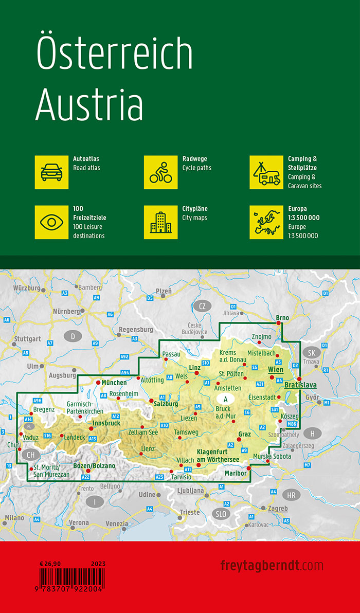 Neben der detaillierten Autokarte 1:150.000 bietet der Große Reise-Atlas Österreich eigene Karten für die Gebiete um München, Brünn, Bozen, Budweis und das Drautal. Diese erweiterte Ausgabe beschreibt zudem 100 sehenswerte Freizeitziele, bietet ein Verzeichnis aller Camping- und Stellplätze und gibt Kurzinfos zu 14 Radrouten, darunter etwa den Donau-Radweg und Tauernradweg.Auto- und Freizeitkarte Österreich 1:150.000Camping & Stellplätze100 Freizeitziele RadwegePlanungskarte ÖsterreichAutokarte Europa 1:3,5 Mio.OrtsregisterCitypläne der LandeshauptstädteDeutsch / Englisch