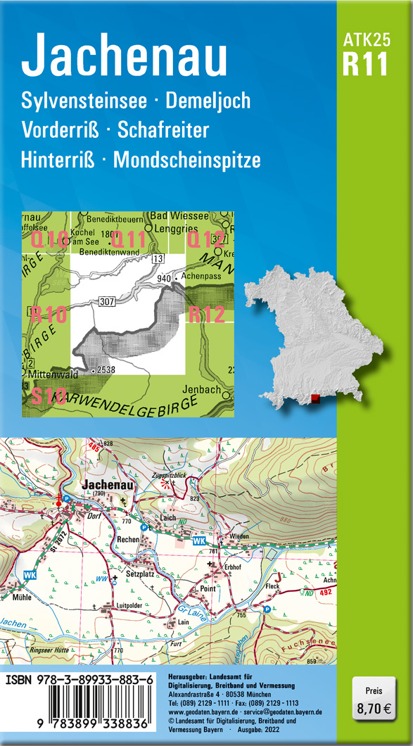 Wer es genau wissen will, greift zur ATK25. Diese Kartenserie im Maßstab 1:25000 bildet mit ihrer detaillierten Darstellung das komplette Verkehrsnetz mit allen Straßen und Wegen ab.237 Einzelblätter stellen Bayern flächendeckend dar. Ein Kartenblatt umfasst ca. 21 km x 22 km.Was bietet die ATK25?- individuelle Freizeitgestaltung mit allen ausgeschilderten Wander- und Radwanderwegen- sichere Orientierung auch abseits der markierten Routen- umfangreiches Spektrum an Freizeiteinrichtungen und Sehenswürdigkeiten- anschauliche Wiedergabe der GeländeformenKartenblatt ATK25-R11 Jachenau:REGION: Oberbayern, Tirol, Isarwinkel, KarwendelORTE: Jachenau, Hinterriß, Niggeln, Höfen