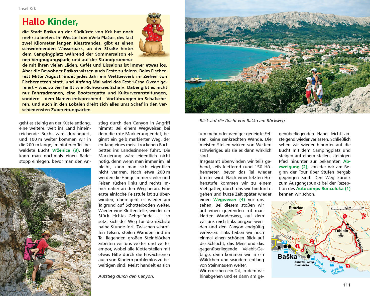 Als Entscheidungshilfe für die Tourenauswahl gibt es Altersempfehlungen, bei den Wanderungen helfen Angaben zum Schwierigkeitsgrad und zur Gehzeit. Jede Tour wird mit einer detaillierten Wegbeschreibung mit Karten und Höhenprofilen vorgestellt. Außerdem stehen GPS-Daten zum Download auf der Website des Verlags bereit. Und speziell für die Kinder erzählt das Maskottchen »Kuna« Wissens- und Staunenswertes über das Urlaubsland Kroatien und die dort lebenden Tiere und Pflanzen.