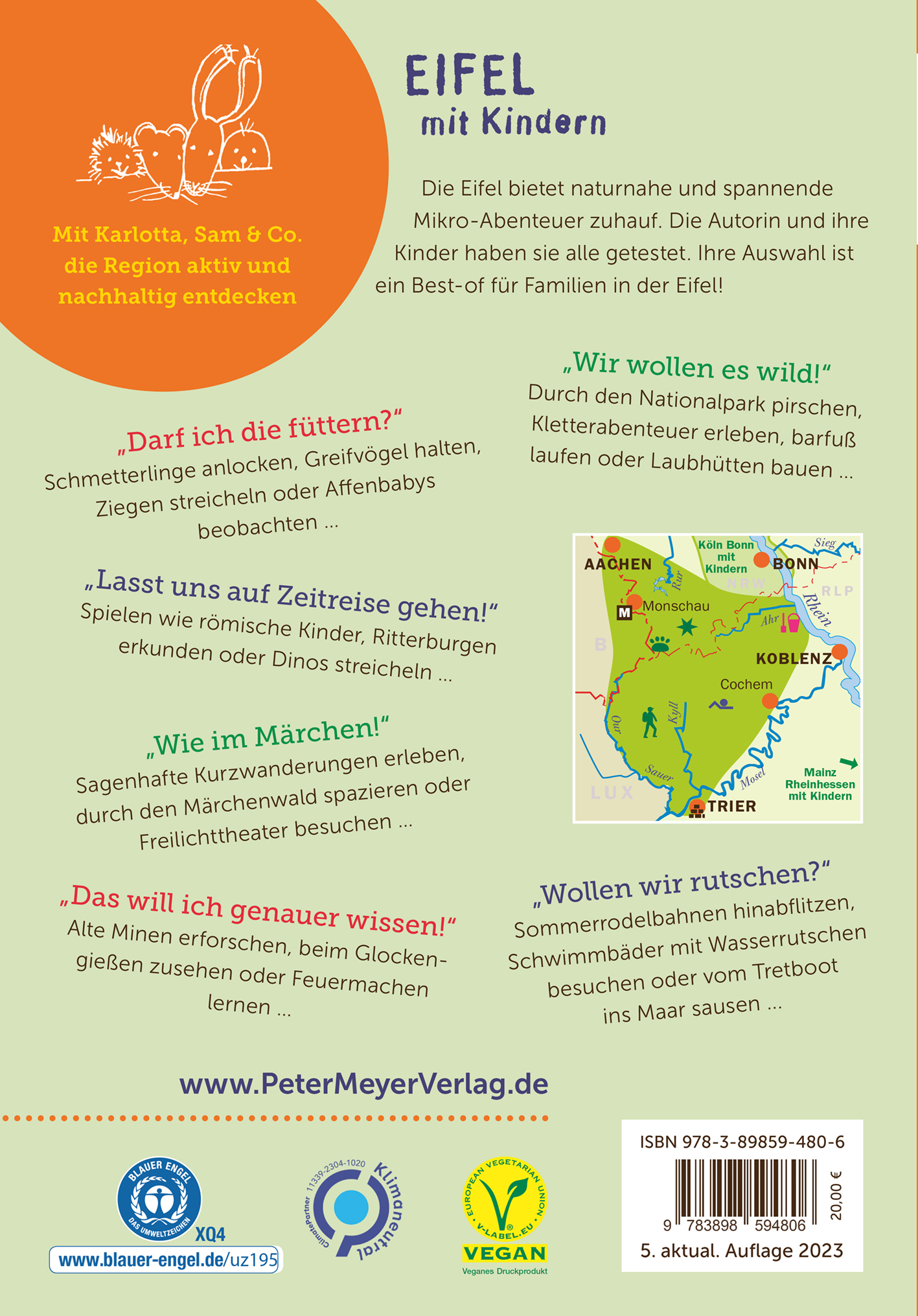 | Schlagworte | Aachen • Abenteuer mit Kindern Eifel • Ahr • Ahrtal • Ausflug mit Familie • Bitburg • Eifel-Buch • Hohes Venn • Mikroabenteuer Eifel • Mosel • Öko-Reiseführer • Rureifel • Schneifel • Trier • Unterwegs mit Kindern • Urlaub mit Kindern • Vulkaneifel • Wandern mit Kindern |