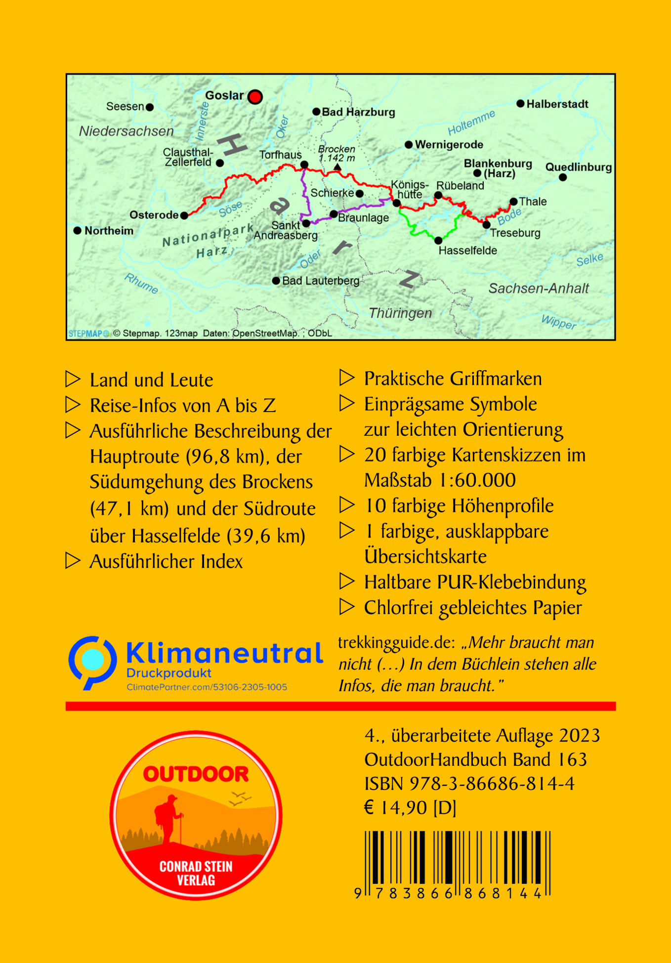 Die 100 km des Hauptweges werden in diesem Buch genau beschrieben, ebenso einige Abstecher und Varianten wie die Brockenumgehung. Exakte Kilometerangaben, Karten, Höhenprofile und GPS-Daten garantieren eine gute Orientierung. Bei der Organisation der Trekkingtour helfen Hinweise zu Einkehr- und Übernachtungsmöglichkeiten sowie Verkehrsanbindungen und weiterer Infrastruktur. Wissenswertes zum Harz und zu den Sehenswürdigkeiten am Wegesrand rundet den Führer ab.