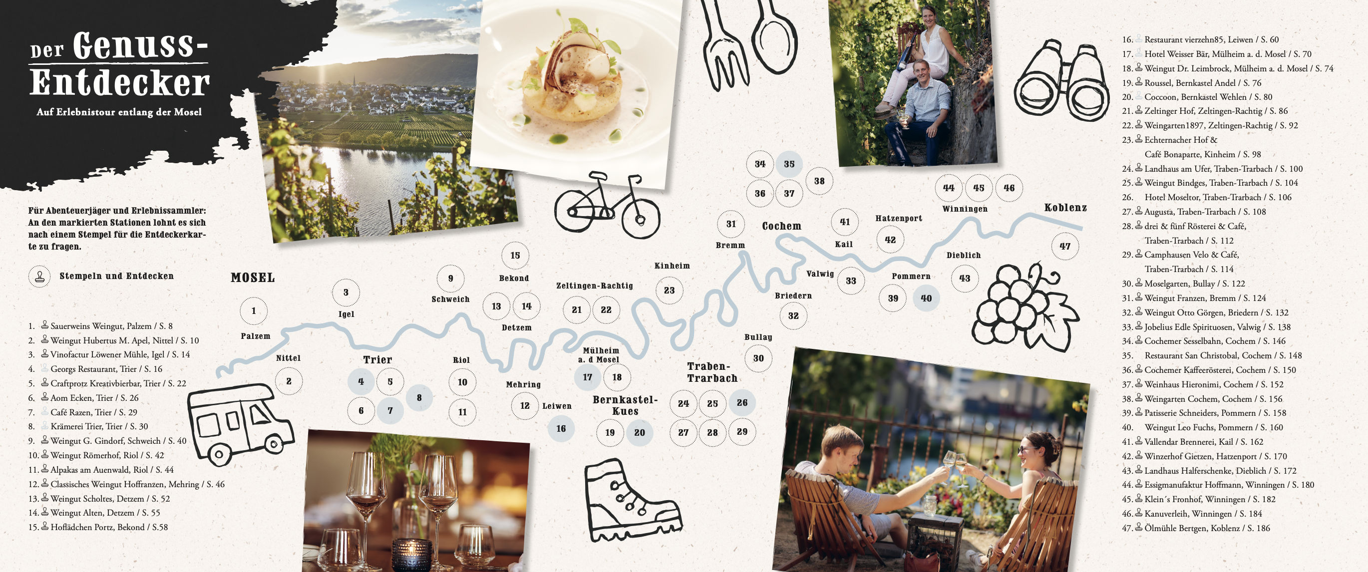 ekz.bibliotheksservice GmbH, Sabine RoeskeDer Titel des Autor*innenquartetts beschreibt eine Reise entlang der Mosel von der südlichen Moselgemeinde Palzem in nördlicher Richtung bis nach Koblenz, wo die Mosel am Deutschen Eck in den Rhein mündet. Der Text-/Bildband (mit deutlich mehr Fotos als Text) stellt in Fließrichtung der Mosel viele kulinarische Genussorte, Winzer und Weingüter, Brauereien und Freizeitaktivitäten vor. Der Fokus liegt auf interessanten Geschichten aus der Region und Informationen über die einzelnen Gastgeber.
