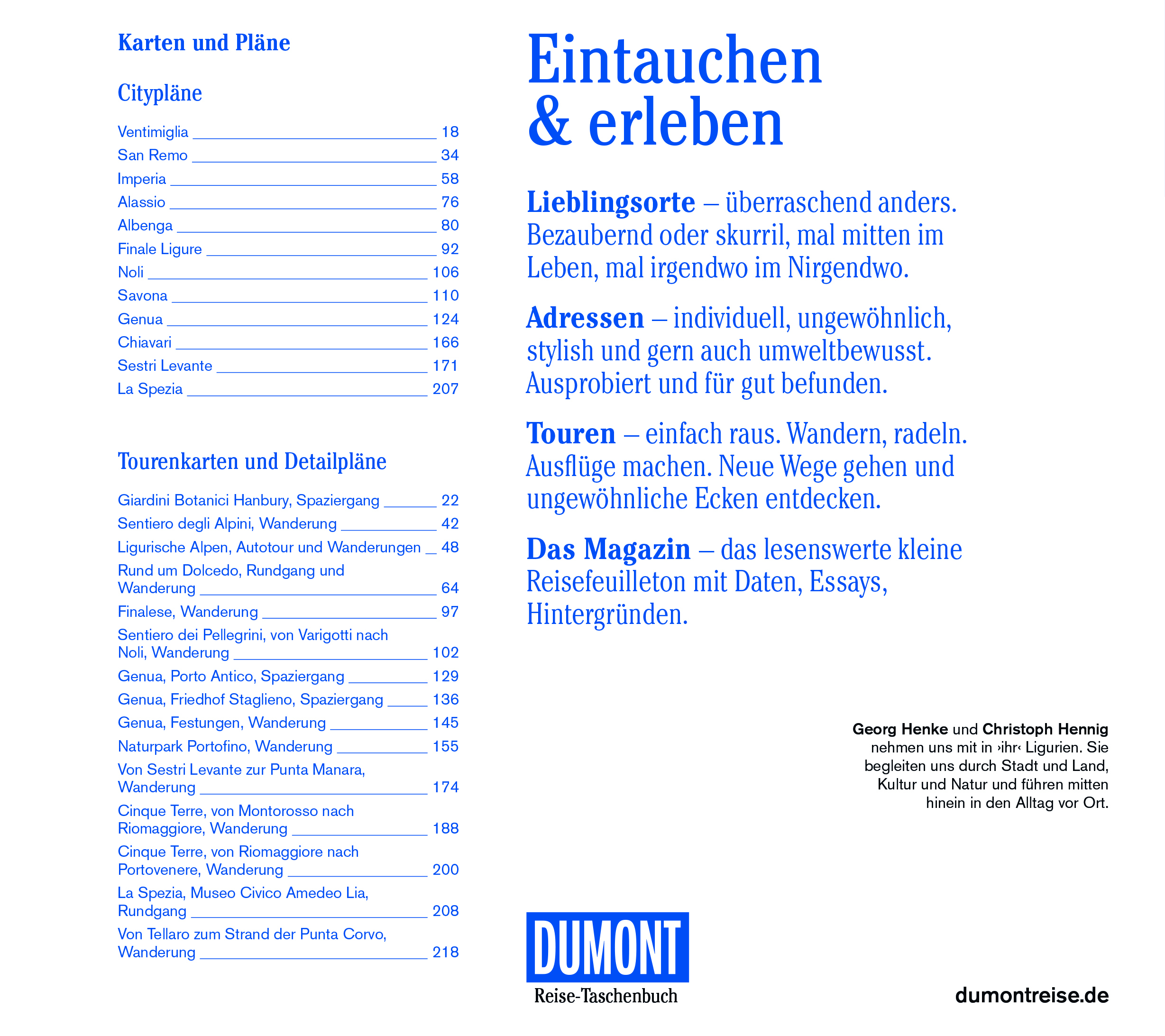 Die AutorenGeorg Henke bereist seit mehr als dreißig Jahren die Regionen Nordwest- und Mittelitaliens. Christoph Hennig hat sogar fünf Jahre in den Cinque Terre gelebt und vor allem die Riviera di Levante bis in den letzten Winkel erkundet. Beide Autoren sind begeisterte Wanderer, gemeinsam haben sie auch den DuMont-Wanderführer zu Ligurien verfasst.