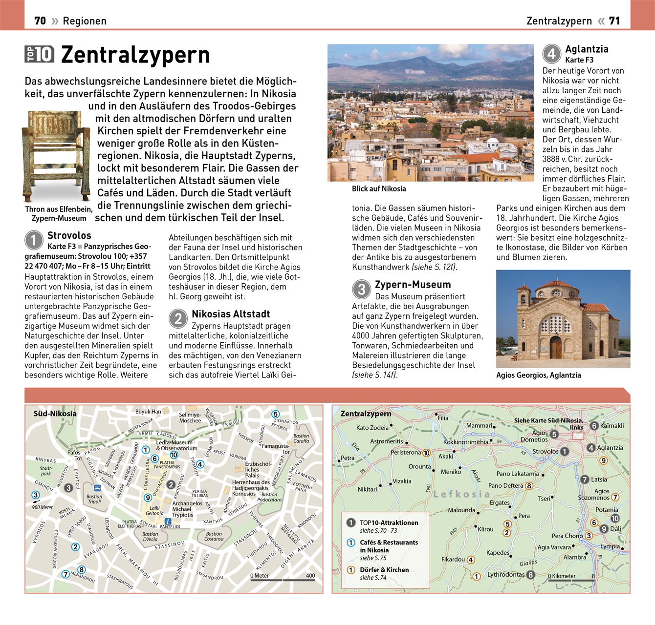 Bestaunen Sie die schönsten Kirchen in Zentralzypern, entspannen Sie an den traumhaftesten Stränden in Südwestzypern und besuchen Sie die interessantesten Festivals in Nordzypern - im TOP10 Zypern-Reiseführer werden die einzelnen Regionen Zyperns übersichtlich und ausführlich porträtiert. Stimmungsvolle Fotos und detaillierte Regionalkarten zeigen berühmte Sehenswürdigkeiten, charmante Städte und Dörfer sowie Restaurant-, Shopping- oder Tourenvorschläge auf einen Blick.
