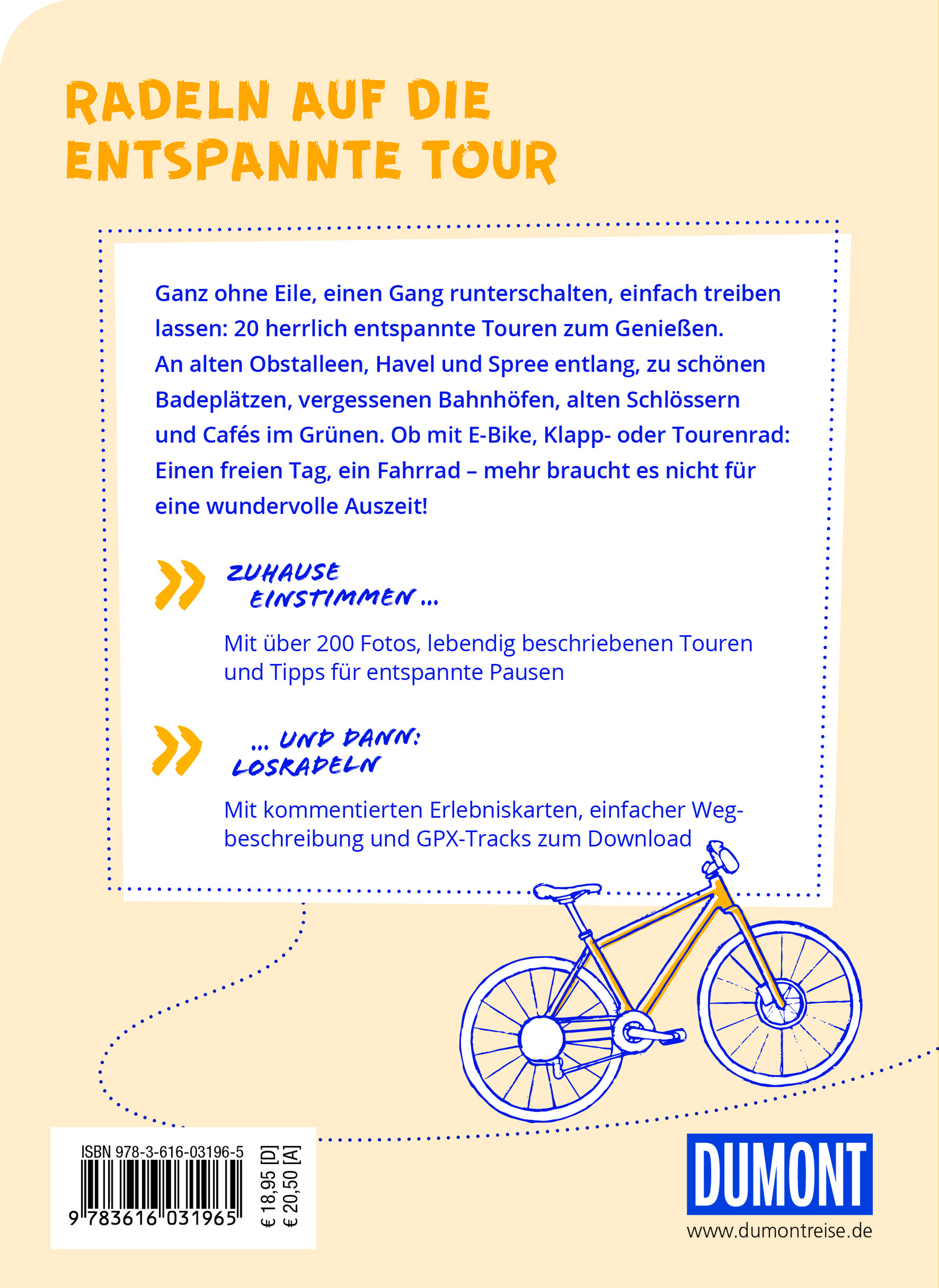 Ganz ohne Eile, einen Gang runterschalten, einfach mal treiben lassen: 20 herrlich entspannte Touren zum Genießen! An alten Obstalleen, Havel und Spree entlang, zu schönen Badeplätzen, vergessenen Bahnhöfen, alten Schlössern und Cafés im Grünen. Den Fahrtwind um die Nase spüren und dabei Besonderes am Wegesrand entdecken. Einen freien Tag, ein Fahrrad - mehr braucht es nicht für eine wundervolle Auszeit!