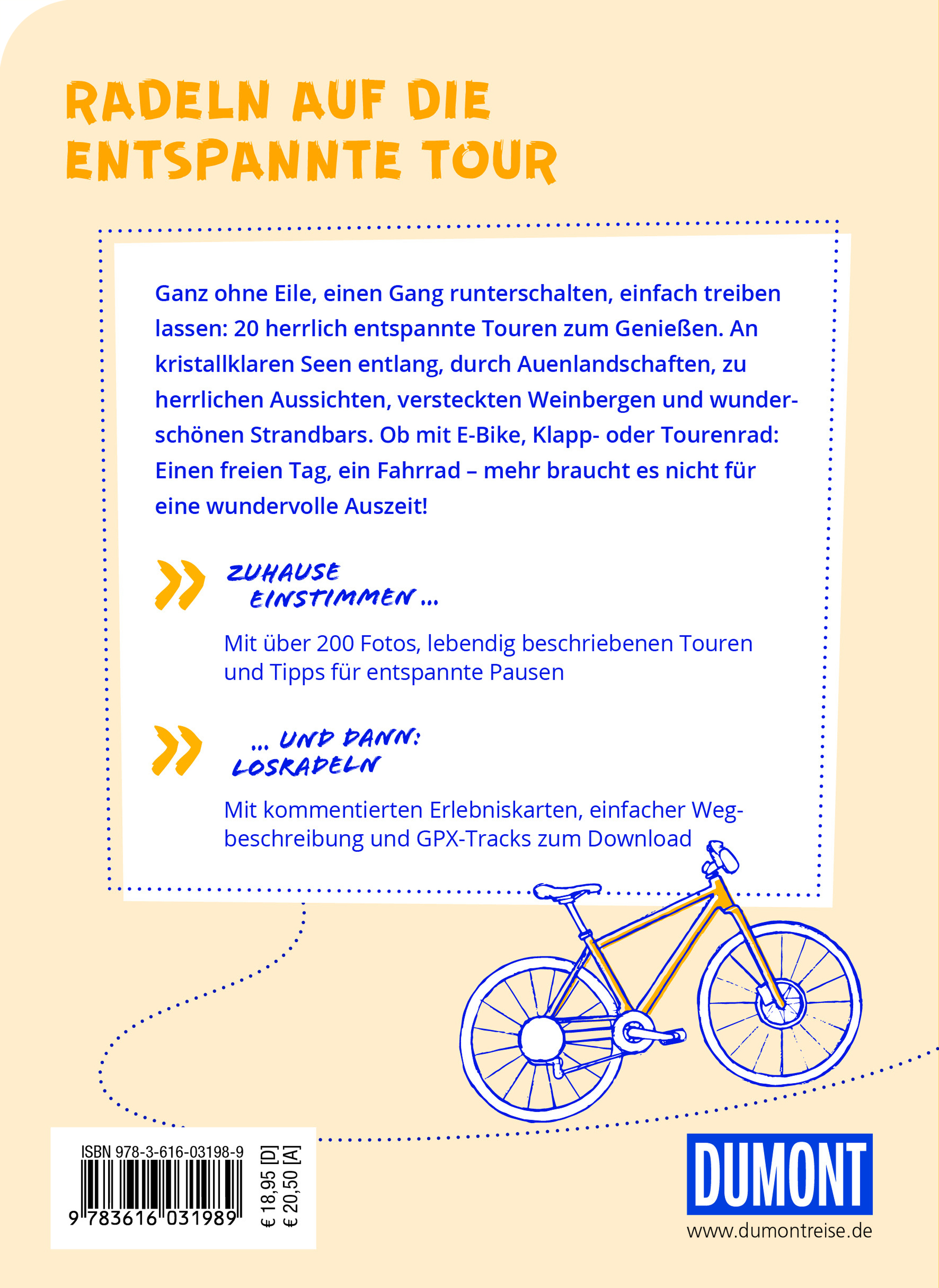 Ganz ohne Eile, einen Gang runterschalten, einfach mal treiben lassen: 20 herrlich entspannte Touren zum Genießen! An kristallklaren Seen entlang, durch Auenlandschaften, zu herrlichen Aussichten, versteckten Weinbergen und wunderschönen Strandbars. Den Fahrtwind um die Nase spüren und dabei Besonderes am Wegesrand entdecken. Einen freien Tag, ein Fahrrad - mehr braucht es nicht für eine wundervolle Auszeit!