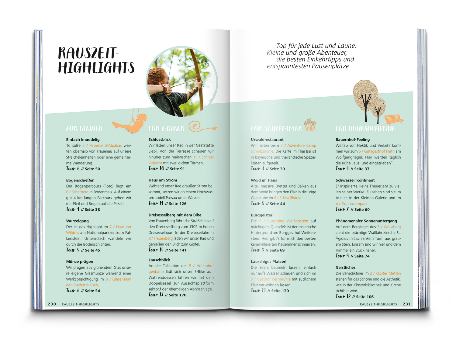 Bei der Tourenauswahl helfen Highlight-Listen für Kinder, E-Biker, Schlemmer und Ruhesuchende. Dank Eventkalender planst du deine Route immer zur besten Zeit und mit Radcheck und Packliste bist du bestens gerüstet fürs Heimat- oder Urlaubsabenteuer. Jede Tour wird ergänzt um Einkehrtipps, Anreiseinfos, Höhenprofil und Tourenkarte.