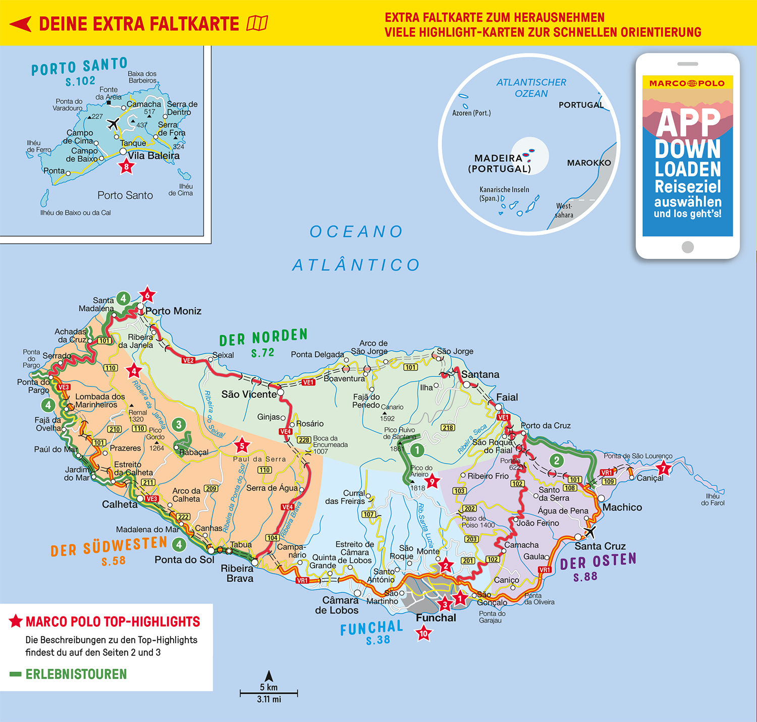 Mit den MARCO POLO Erlebnistouren verpasst du keine der Besonderheiten der Insel. Die kostenlose MARCO POLO Touren App auf deinem Handy sorgt für super Orientierung dank Online- und Offline-Karten. So kannst du Madeiras höchste Gipfel erkunden, entlang der berühmten Levadas durch grüne Täler schlendern oder die steilen Bananenterrassen des Südwestens der Insel bewundern.