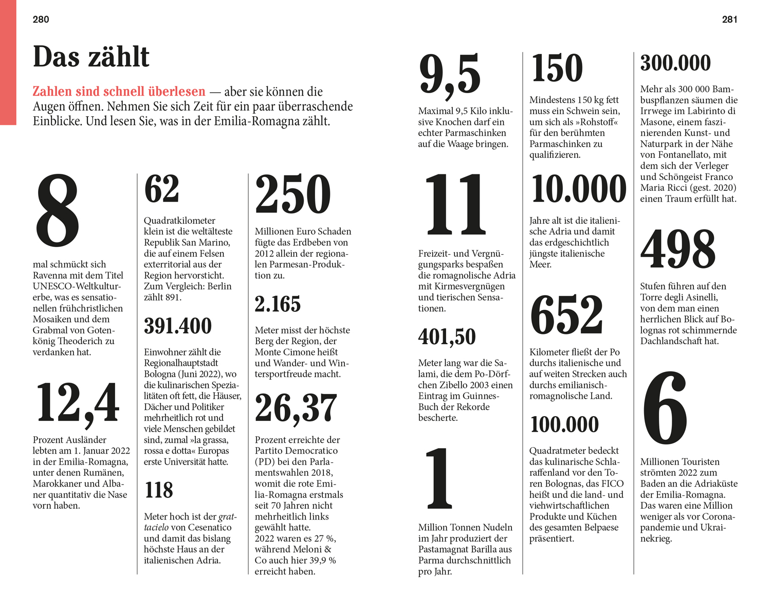 Senkrechtstarter, Überflieger, Querfeldein. Vor Ort - die Kapitel: Westliche Emilia, Rund um Parma und Reggio nell'Emilia, In und um Modena, Von Bologna gen Romagna, Das Po-Delta, Cesenatico - Cattolica. Das Kleingedruckte (Reiseinfos von A bis Z). Das Magazin. Offene Fragen.