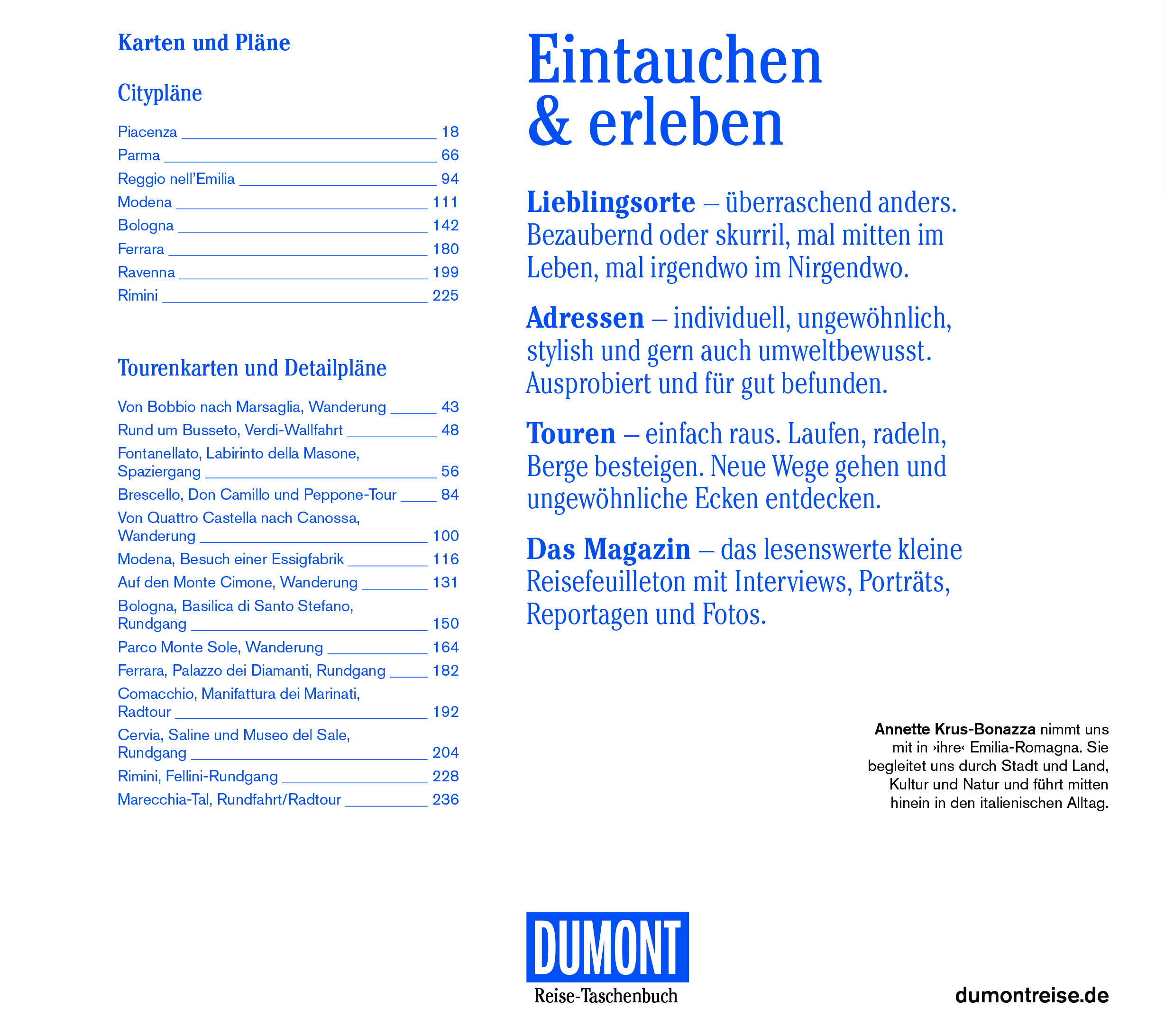 Die AutorinAnnette Krus-Bonazza, studierte Historikerin und seit über 30 Jahren regelmäßig im Belpaese unterwegs, schwärmt von der Einsamkeit der Apenninhöhen und dem rauen Charme der Po-Ebene und wirbt für die romagnolische Adriaküste, die keineswegs nur Sand und Strand zu bieten hat. Beim DuMont Reiseverlag sind von ihr auch noch das Reisetaschenbuch Marken sowie die beiden DuMont-direkt-Bände Triest und Italienische Adria erschienen.