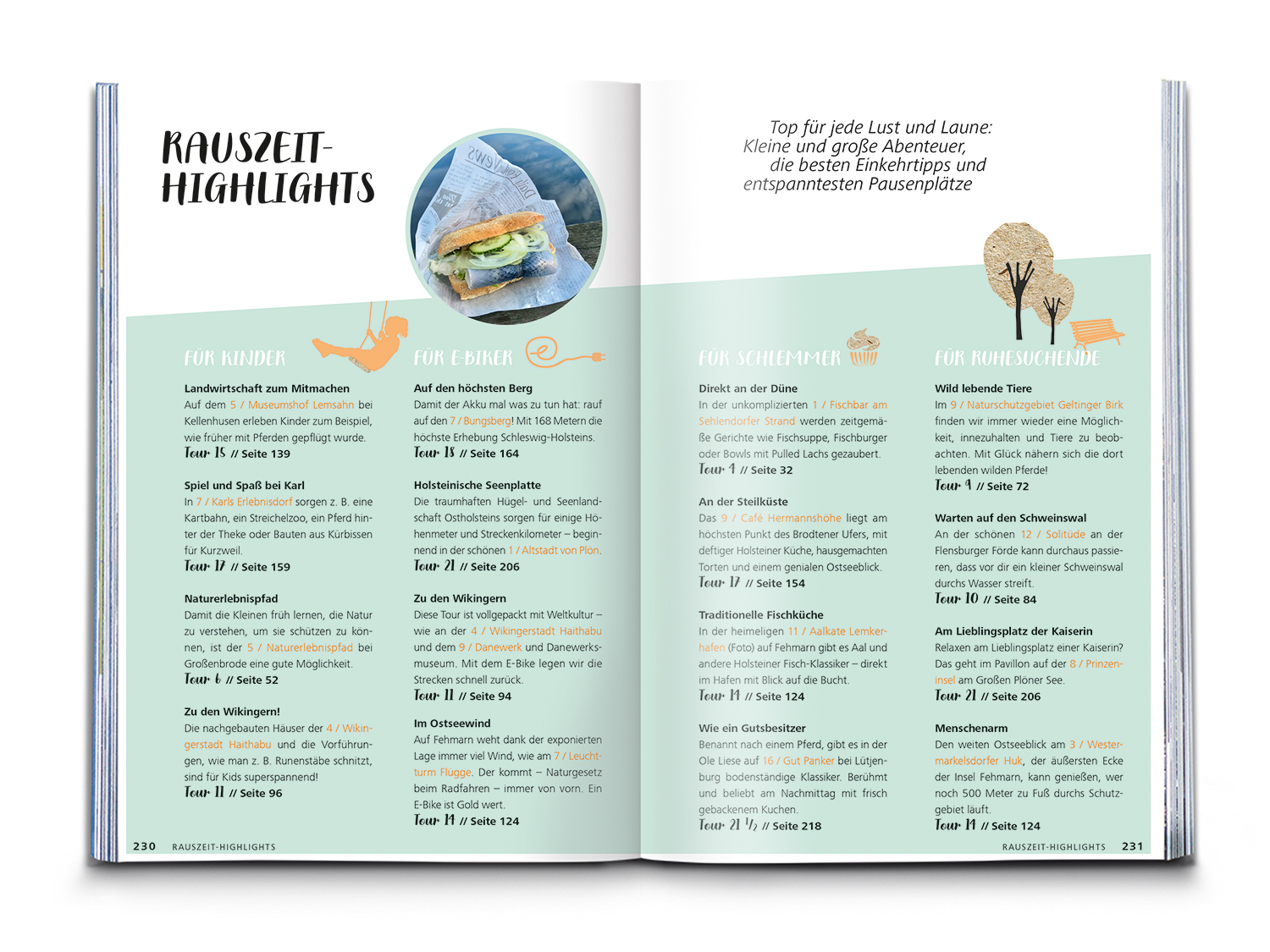 Highlight-Listen für Kinder, E-Biker, Schlemmer und Ruhesuchende helfen bei der Tourenauswahl. Dank Eventkalender planst du deine Route zur besten Zeit und mit Radcheck und Packliste geht es gut gerüstet ins Heimat- oder Urlaubsabenteuer. Bei jeder Tour finden sich Einkehrtipps, Anreiseinfos, Höhenprofil und Tourenkarte.