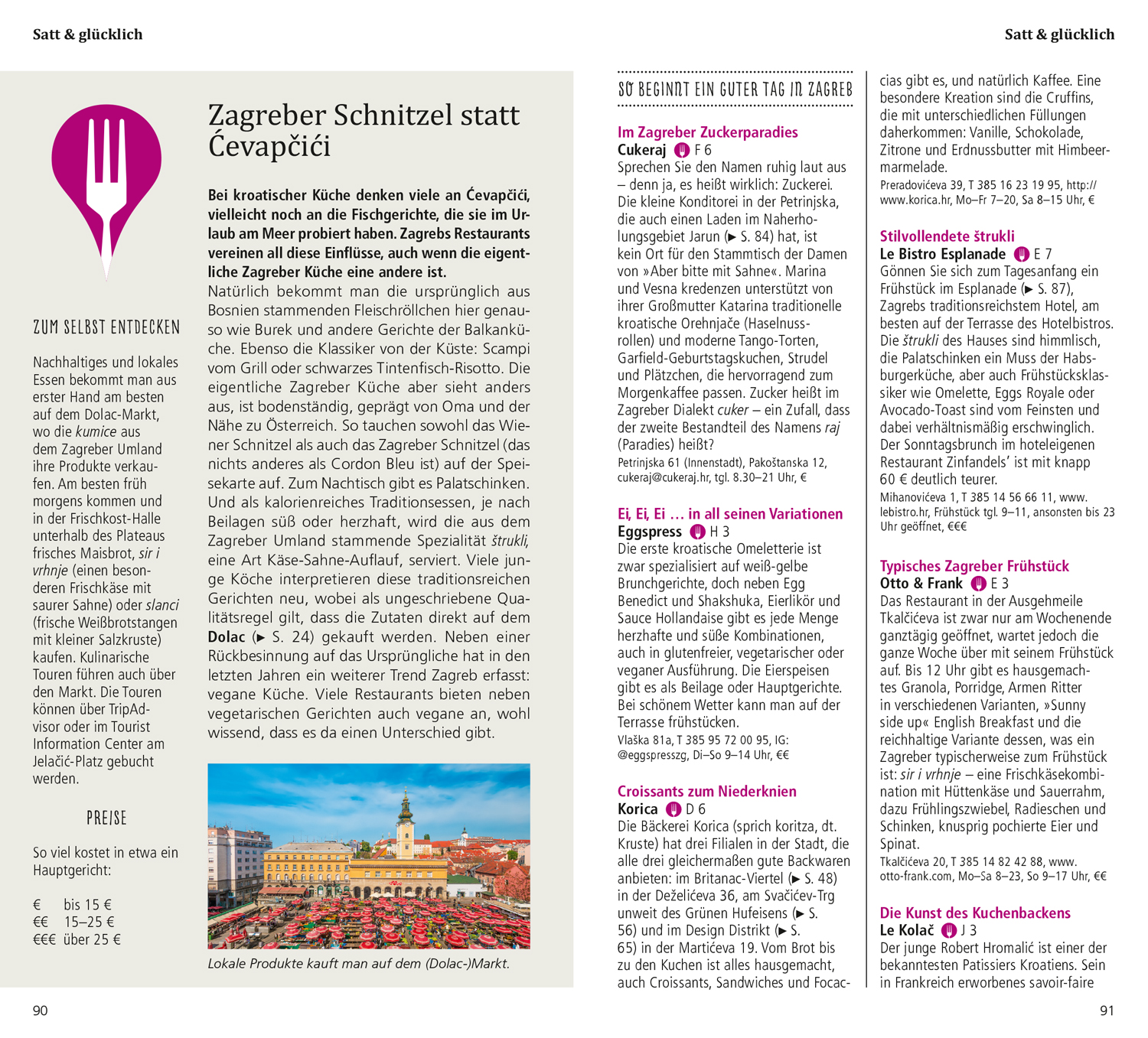 Mit den 15 »Direkt-Kapiteln« des Reiseführers von Patricia Fridrich lohnt sich der Citytrip zu jeder Zeit: im Sommer als Kontrastprogramm zum Strand, im Winter, um die vielen Weihnachtsmärkte zu besuchen und auf dem Slijeme Ski zu fahren; an Allerheiligen, um die Stimmung auf dem Mirogoj-Friedhof einfangen, und im Frühjahr, um vom Strossmartre verliebt auf die Stadt hinunter zu blicken. In eigenen Kapiteln erfahren Sie, wo es sich in fremden Betten gut schläft, wo Sie glücklich satt werden, wohin die Zagreber zum Stöbern und Entdecken gehen und wohin es sie zieht, wenn die Nacht beginnt.