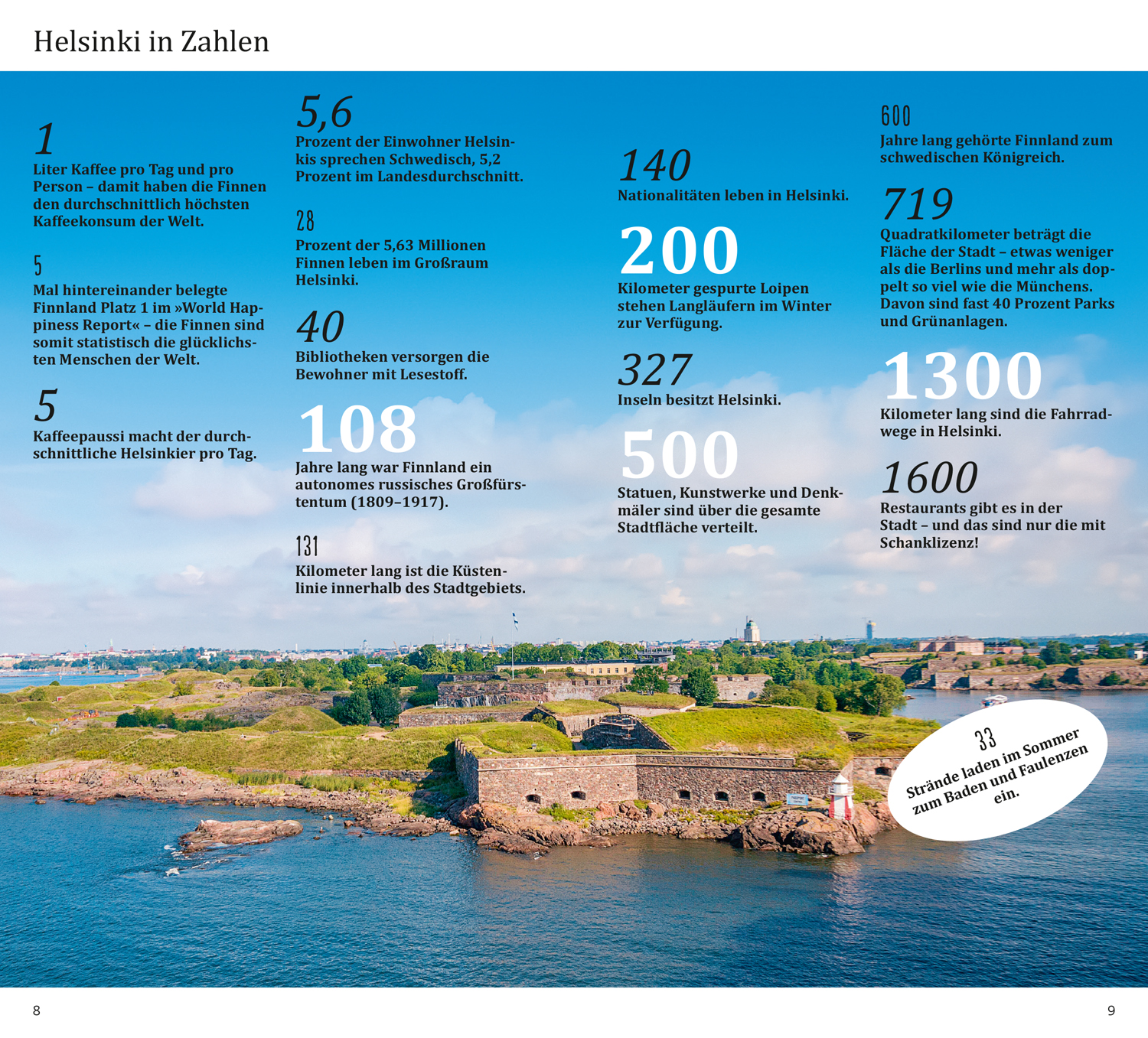 Heiß haben die Helsinkier es gerne, vor allem beim Schwitzen in der Sauna. In ihrer nah am Wasser gebauten Großstadt im Westentaschenformat lieben sie helle Nächte, finnisches Design, Kaffeepaussi, schräge Wettkämpfe und skurrile Geschichten, den langsamen Tango und Picknick in den Schären.