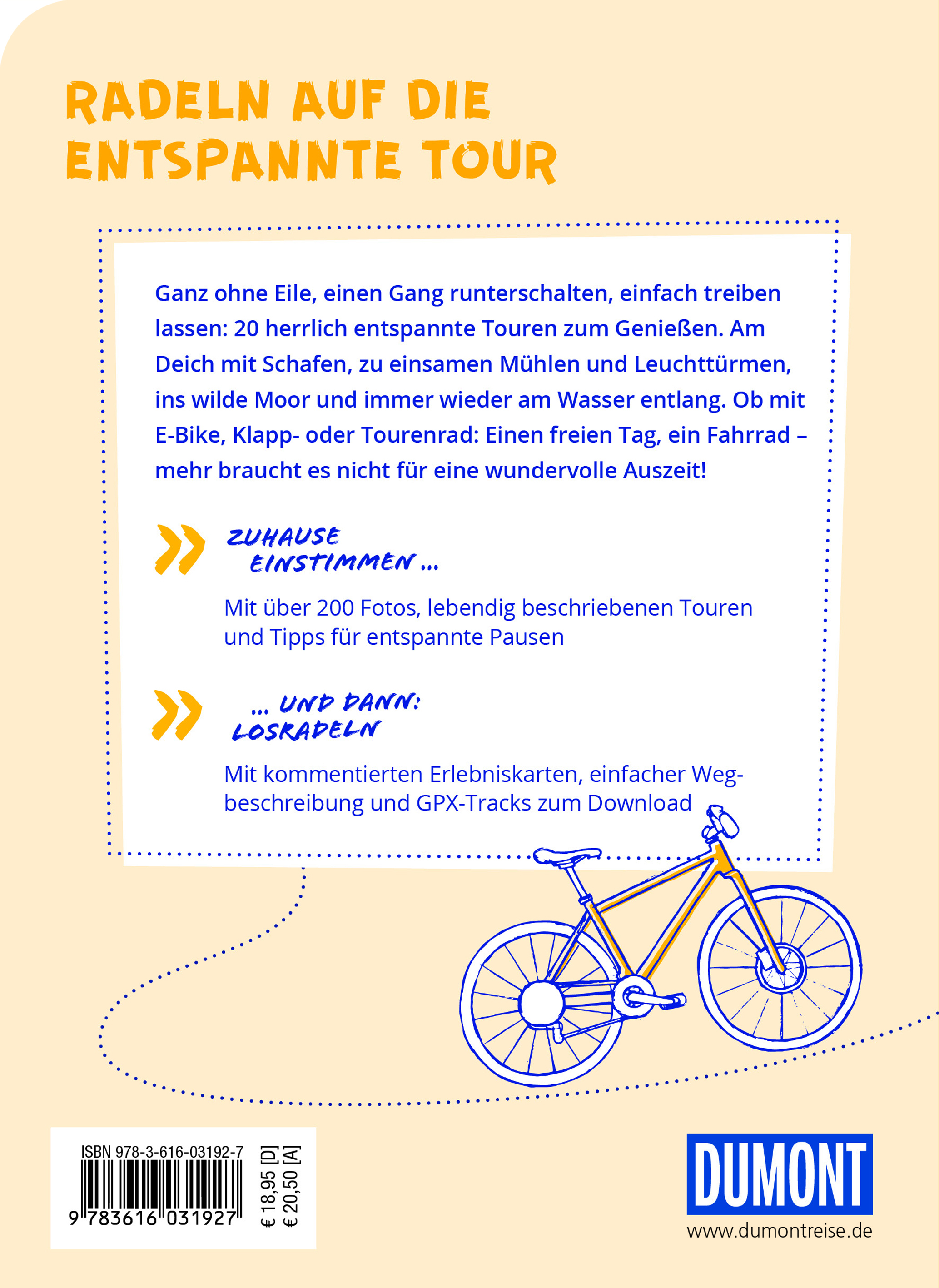 Ganz ohne Eile, einen Gang runterschalten, einfach mal treiben lassen: 20 herrlich entspannte Touren zum Genießen! In die ostfriesische Weite: Am Deich mit Schafen, zu einsamen Mühlen und Leuchttürmen, verwunschenen Schlössern, ins wilde Moor und immer wieder am Wasser entlang. Den Fahrtwind um die Nase spüren und dabei Besonderes am Wegesrand entdecken. Einen freien Tag, ein Fahrrad - mehr braucht es nicht für eine wundervolle Auszeit!