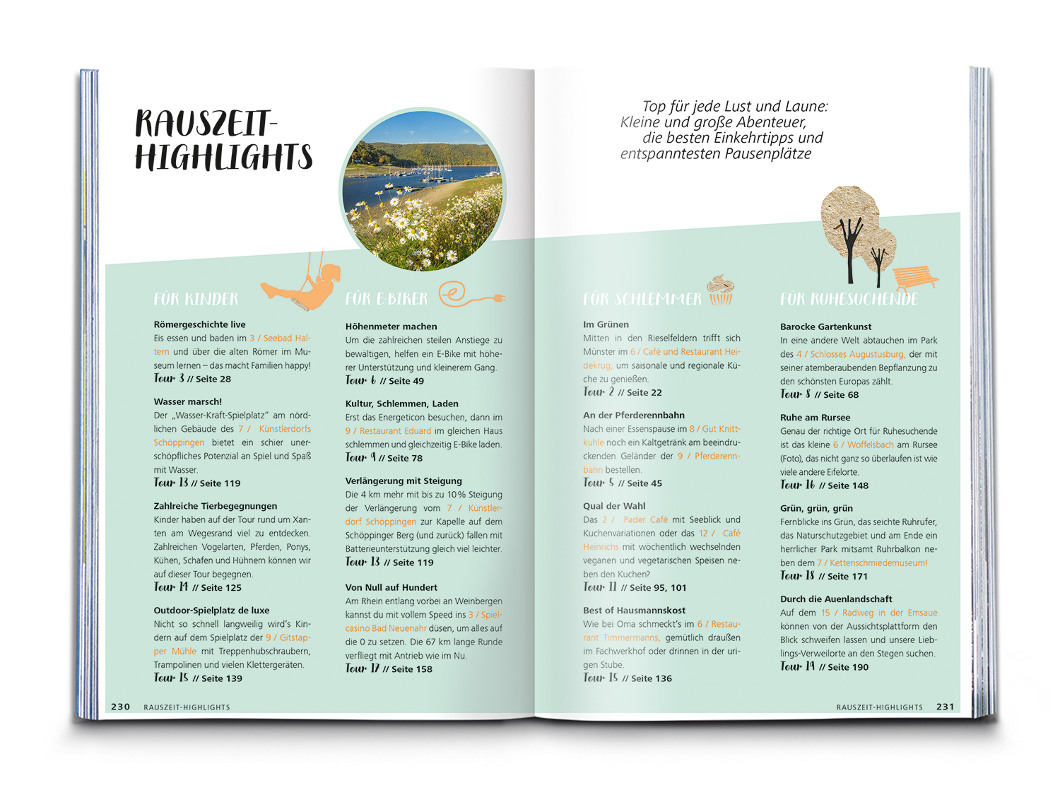 Highlight-Listen für Kinder, E-Biker, Schlemmer und Ruhesuchende helfen bei der Tourenauswahl. Dank Eventkalender planst du deine Route zur besten Zeit und mit Radcheck und Packliste geht es gut gerüstet ins Heimat- oder Urlaubsabenteuer. Bei jeder Tour finden sich Einkehrtipps, Anreiseinfos, Höhenprofil und Tourenkarte.