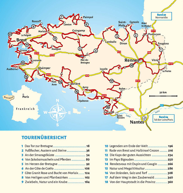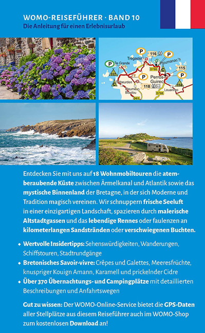 Über 3500 km in 18 Touren durch die Bretagne entlang der Küste sowie durch das Landesinnere. Zu jeder Tour zeigt eine Übersichtskarte die Fahrstrecke zu den beschriebenen Sehenswürdigkeiten und Stellplätzen.