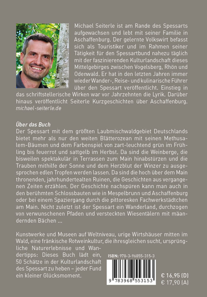 Michael Seiterle ist am Rande des Spessarts aufgewachsen und lebt mit seiner Familie in Aschaffenburg. Der gelernte Volkswirt befasst sich als Touristiker und im Rahmen seiner Tätigkeit für den Spessartbund nahezu täglich mit der faszinierenden Kulturlandschaft dieses Mittelgebirges zwischen Vogelsberg, Rhön und Odenwald. Er hat in den letzten Jahren immer wieder Wander-, Reise- und kulinarische Führer über den Spessart veröffentlicht. Einstieg in das schriftstellerische Wirken war vor Jahrzehnten die Lyrik. Darüber hinaus veröffentlicht Seiterle Kurzgeschichten über Aschaffenburg. michael-seiterle.de