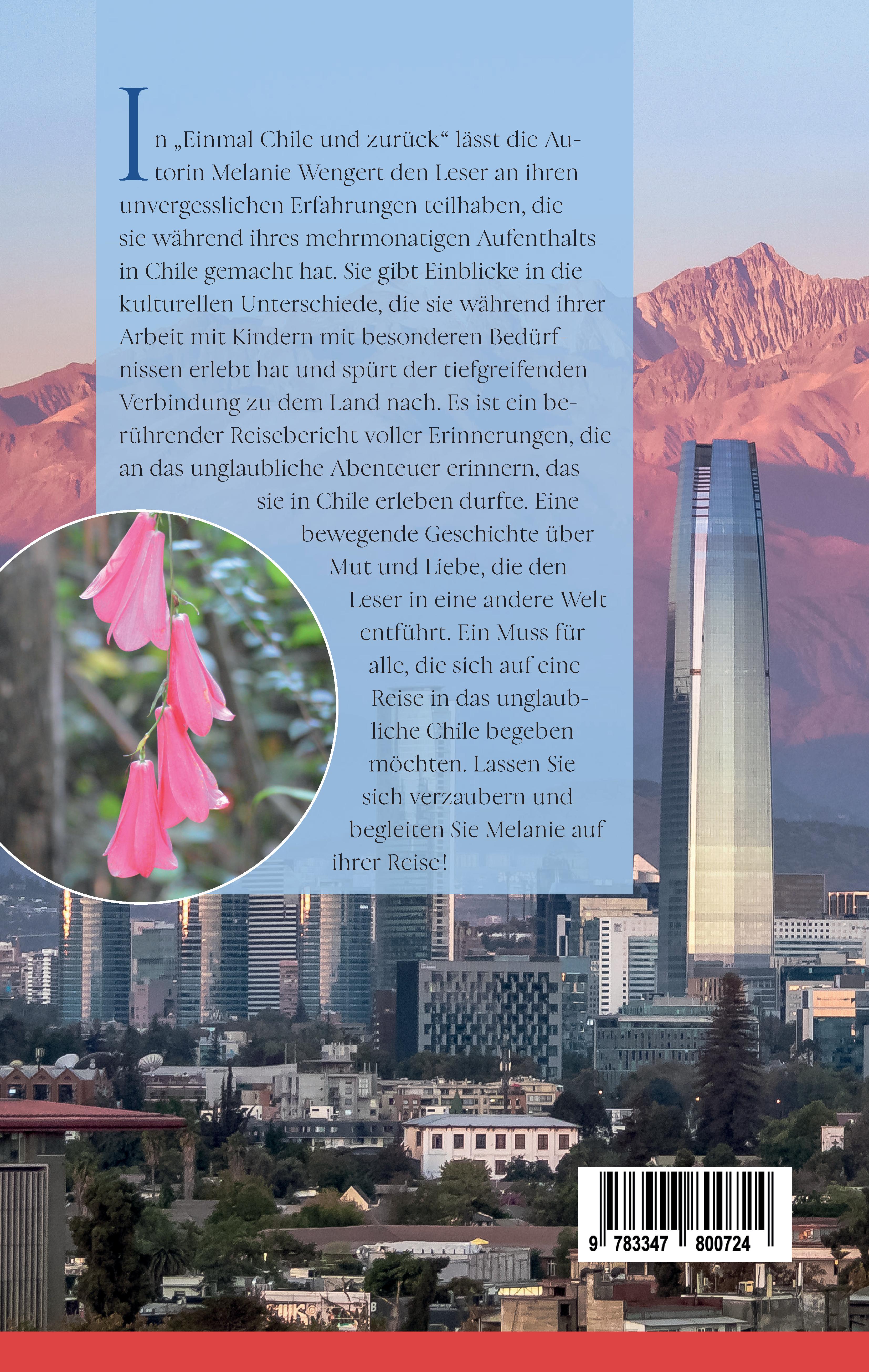 In "Einmal Chile und zurück" lässt die Autorin Melanie Wengert den Leser an ihren unvergesslichen Erfahrungen teilhaben, die sie während ihres mehrmonatigen Aufenthalts in Chile gemacht hat. Sie gibt Einblicke in die kulturellen Unterschiede, die sie während ihrer Arbeit mit Kindern mit besonderen Bedürfnissen erlebt hat und spürt der tiefgreifenden Verbindung zu dem Land nach. Es ist ein berührender Reisebericht voller Erinnerungen, die an das unglaubliche Abenteuer erinnern, das sie in Chile erleben durfte. Eine bewegende Geschichte über Mut und Liebe, die den Leser in eine andere Welt entführt. Ein Muss für alle, die sich auf eine Reise in das unglaubliche Chile begeben möchten. Lassen Sie sich verzaubern und begleiten Sie Melanie auf ihrer Reise!
