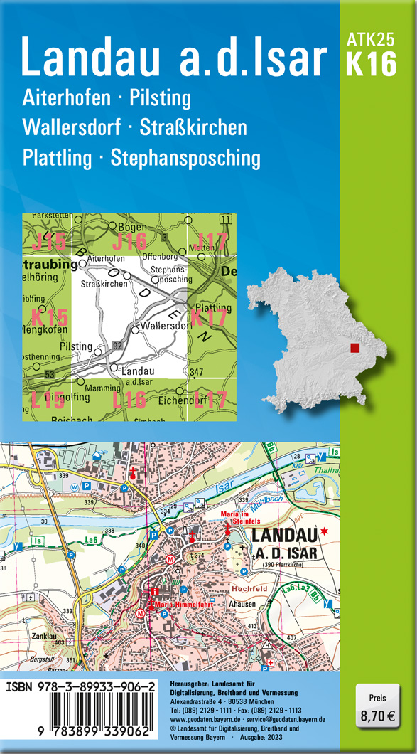 Wer es genau wissen will, greift zur ATK25. Diese Kartenserie im Maßstab 1:25000 bildet mit ihrer detaillierten Darstellung das komplette Verkehrsnetz mit allen Straßen und Wegen ab.237 Einzelblätter stellen Bayern flächendeckend dar. Ein Kartenblatt umfasst ca. 21 km x 22 km.Was bietet die ATK25?- individuelle Freizeitgestaltung mit allen ausgeschilderten Wander- und Radwanderwegen- sichere Orientierung auch abseits der markierten Routen- umfangreiches Spektrum an Freizeiteinrichtungen und Sehenswürdigkeiten- anschauliche Wiedergabe der GeländeformenKartenblatt ATK25-K16 Landau a.d.Isar:REGION: Niederbayern, GäubodenORTE: Landau a.d.Isar, Aiterhofen, Pilsting, Wallersdorf, Straßkirchen, Plattling, Stephansposching, Oberschneiding