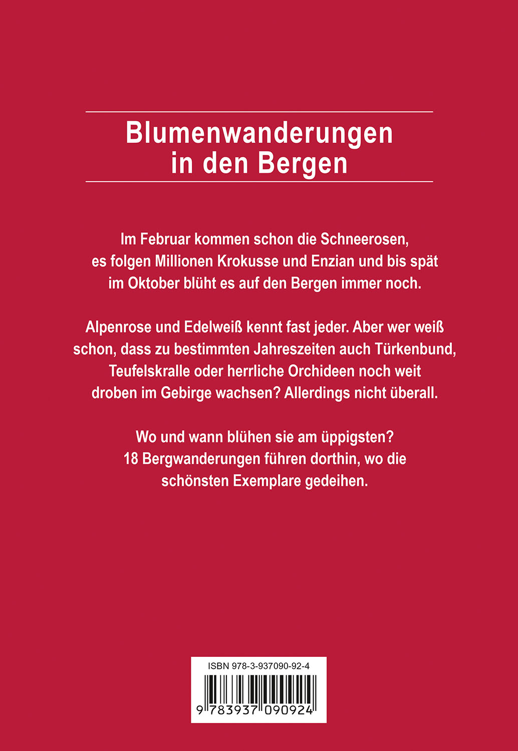 Im Februar kommen schon die Schneerosen, es folgen Millionen Krokusse und Enzian und bis spät im Oktober blüht es auf den Bergen immer noch. Alpenrose und Edelweiß kennt fast jeder. Aber wer weiß schon, dass zu bestimmten Jahreszeiten auch Türkenbund, Teufelskralle oder herrliche Orchideen weit droben im Gebirge wachsen? Allerdings nicht überall. Wo und wann blühen sie am üppigsten? 21 Bergwanderungen führen dorthin, wo die schönsten Exemplare gedeihen. Ab und an geht es auch nach Tirol hinüber, zum Beispiel, um das Edelweiß im Rofangebirge zu bewundern.