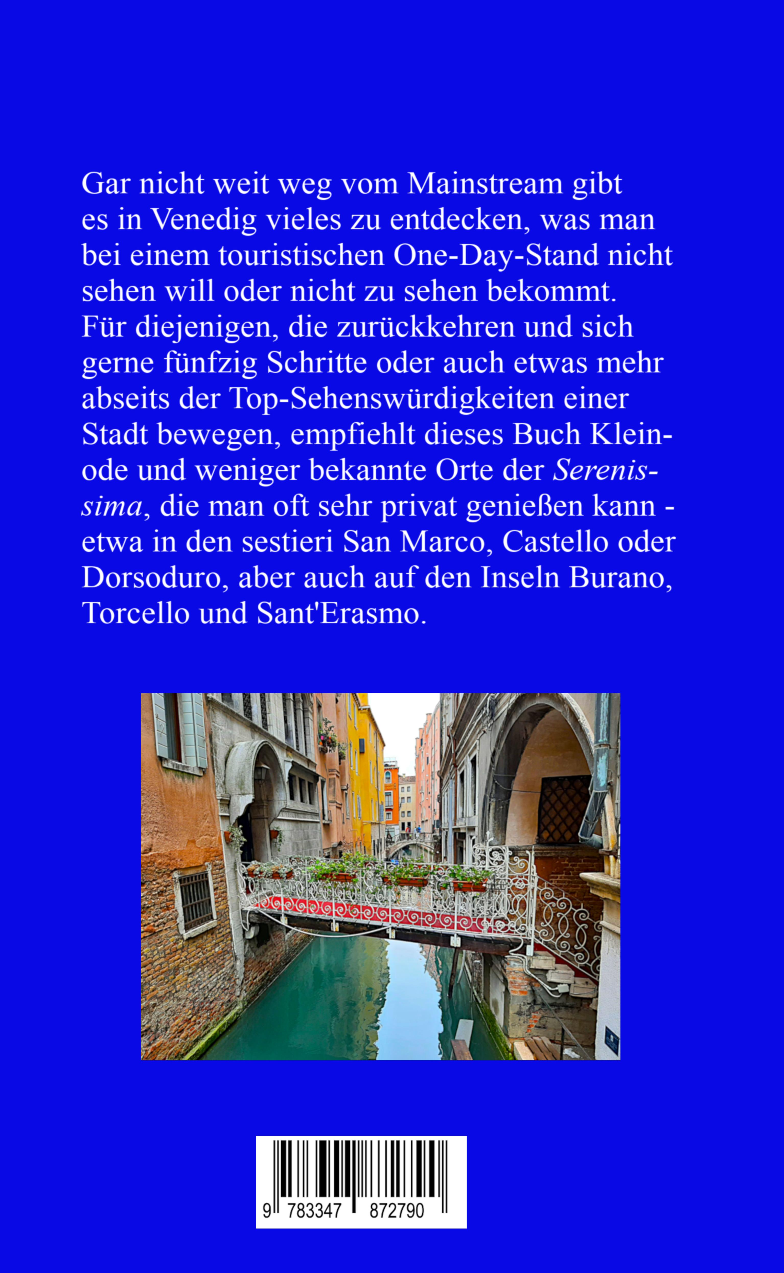 Venedig kennt man - und man kennt es doch nicht. Die Serenissima ist viel mehr als die Piazza San Marco und die Rialtobrücke. Das Buch führt zu Orten abseits des Mainstream, in diejenigen sestiere und Inseln, die nicht im Mittelpunkt des Besucherinteresses stehen. Manchmal sind sie nur fünfzig Schritte entfernt. Fotos und literarische Stadteindrücke zeichnen ein Bild Venedigs, wie es nur diejenigen kennenlernen, die es nicht bei einem einzigen flüchtigen Rendezvous belassen.