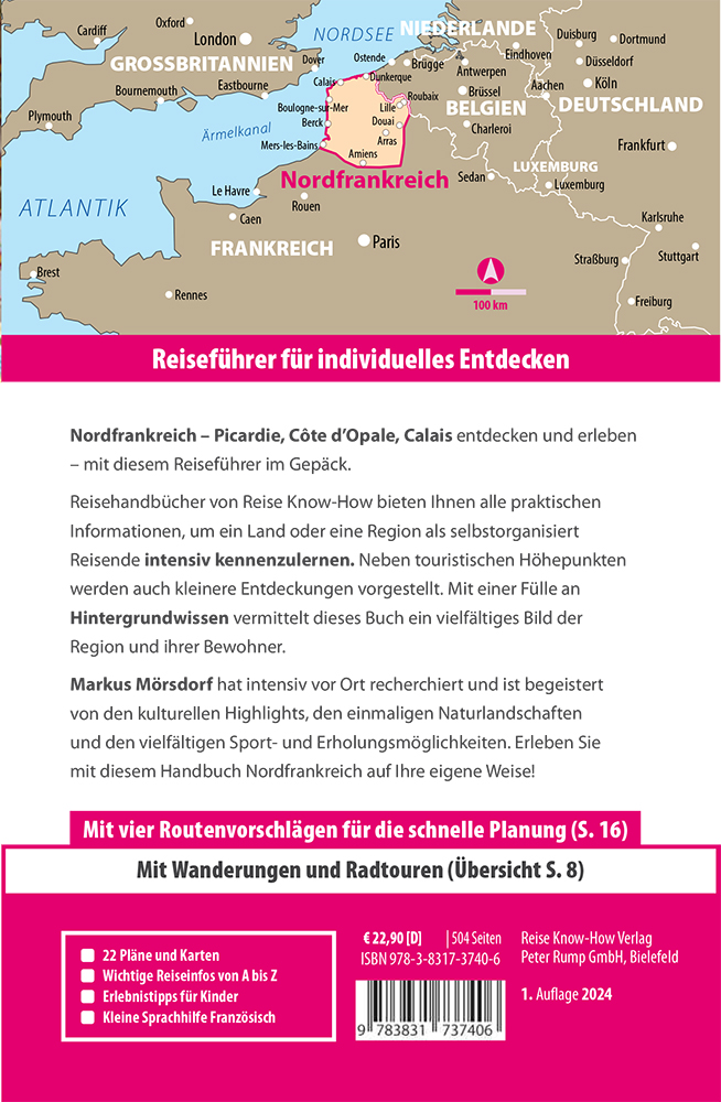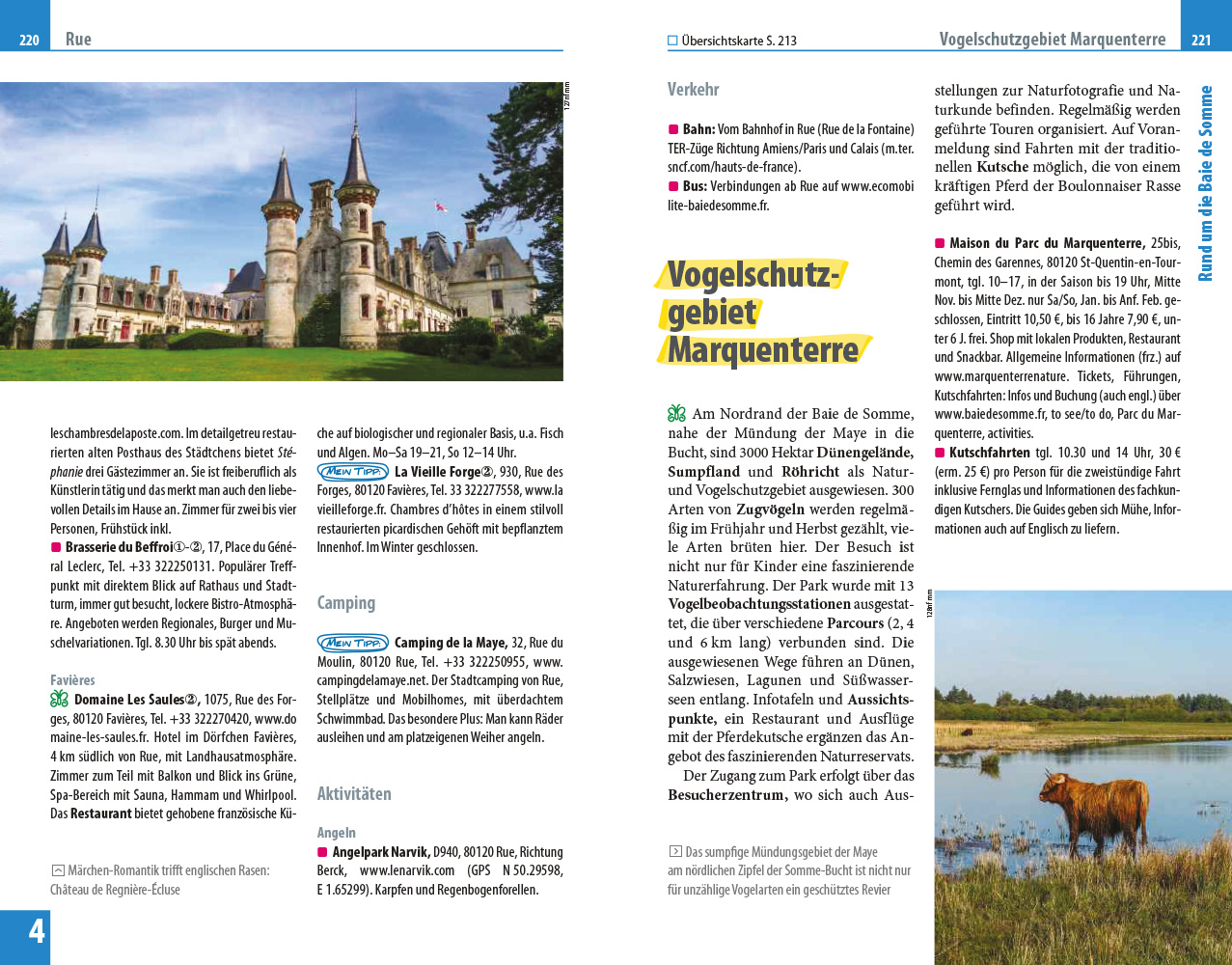 Im erweiterten Vorspann finden sich Übersichtsseiten mit Beschreibungen aller Regionen zwischen Opalküste, Baie de Somme, der Picardie und Französisch-Flandern, eine Jahresübersicht zu Festen und Veranstaltungen, Routenvorschläge und persönliche Top-Tipps des Autors. Neben den Informationen zur Geschichte und den Sehenswürdigkeiten gibt es Hinweise zum Rad- und Wanderurlaub, zu Sportangeboten auf dem Wasser, am Strand und im Hinterland sowie Übernachtungstipps vom Schlosshotel bis zum Naturcamping. Exkurse bieten zahlreiche Hintergrundinformationen und machen bekannt mit den Merk- und Liebenswürdigkeiten der Scht'is. Tipps zu naturnahem und nachhaltigem Reisen sowie zum Reisen mit Kindern helfen bei der individuellen Reiseplanung.
