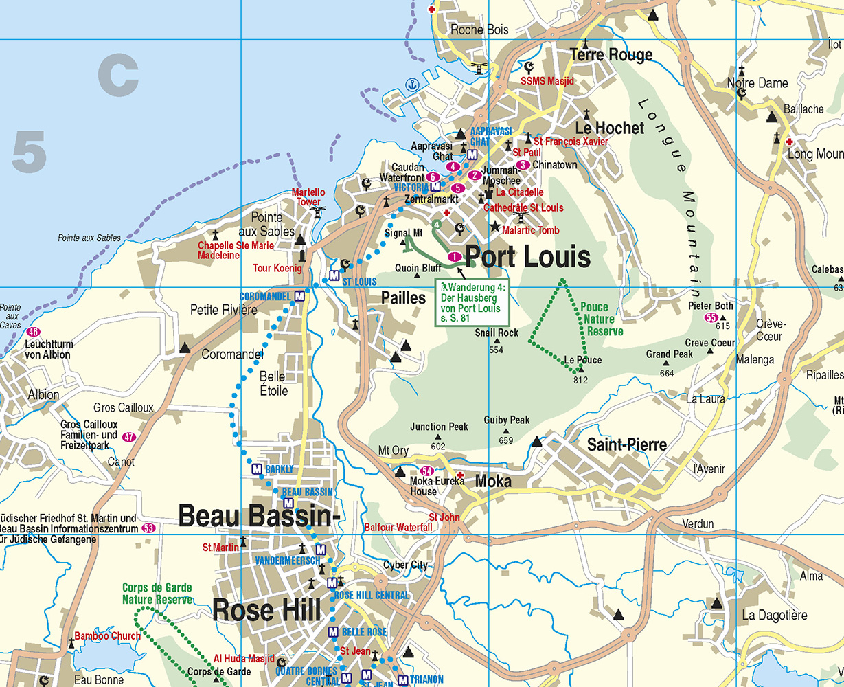 - Inselfaltplan zum Herausnehmen und detaillierter Stadtplan von Port Louis
