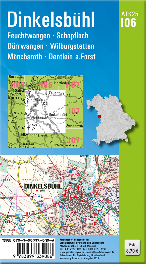 Wer es genau wissen will, greift zur ATK25. Diese Kartenserie im Maßstab 1:25000 bildet mit ihrer detaillierten Darstellung das komplette Verkehrsnetz mit allen Straßen und Wegen ab.237 Einzelblätter stellen Bayern flächendeckend dar. Ein Kartenblatt umfasst ca. 21 km x 22 km.Was bietet die ATK25?- individuelle Freizeitgestaltung mit allen ausgeschilderten Wander- und Radwanderwegen- sichere Orientierung auch abseits der markierten Routen- umfangreiches Spektrum an Freizeiteinrichtungen und Sehenswürdigkeiten- anschauliche Wiedergabe der GeländeformenKartenblatt ATK25-I06 Dinkelsbühl:REGION: MittelfrankenORTE: Dinkelsbühl, Feuchtwangen, Schopfloch, Dürrwangen, Wilburgstetten, Mönchsroth, Dentlein a.Forst