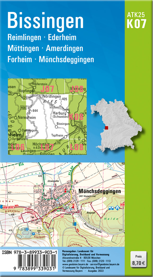 Wer es genau wissen will, greift zur ATK25. Diese Kartenserie im Maßstab 1:25000 bildet mit ihrer detaillierten Darstellung das komplette Verkehrsnetz mit allen Straßen und Wegen ab.237 Einzelblätter stellen Bayern flächendeckend dar. Ein Kartenblatt umfasst ca. 21 km x 22 km.Was bietet die ATK25?- individuelle Freizeitgestaltung mit allen ausgeschilderten Wander- und Radwanderwegen- sichere Orientierung auch abseits der markierten Routen- umfangreiches Spektrum an Freizeiteinrichtungen und Sehenswürdigkeiten- anschauliche Wiedergabe der GeländeformenKartenblatt ATK25-K07 Bissingen:REGION: Schwaben, Schwäbische Alb, RiesORTE: Bissingen, Reimlingen, Ederheim, Möttingen, Amerdingen, Forheim, Mönchsdeggingen